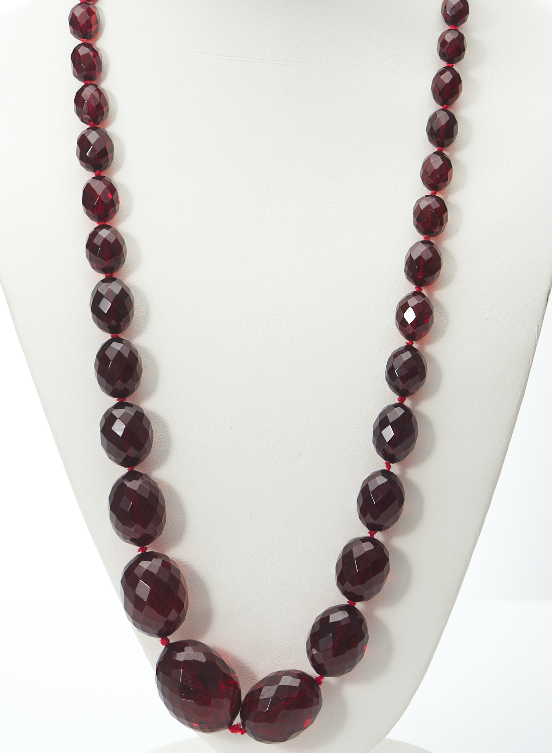 A STRAND OF CHERRY AMBER COLOURED, GRADUATED BAKELITE TO A VINTAGE SCREW CLASP