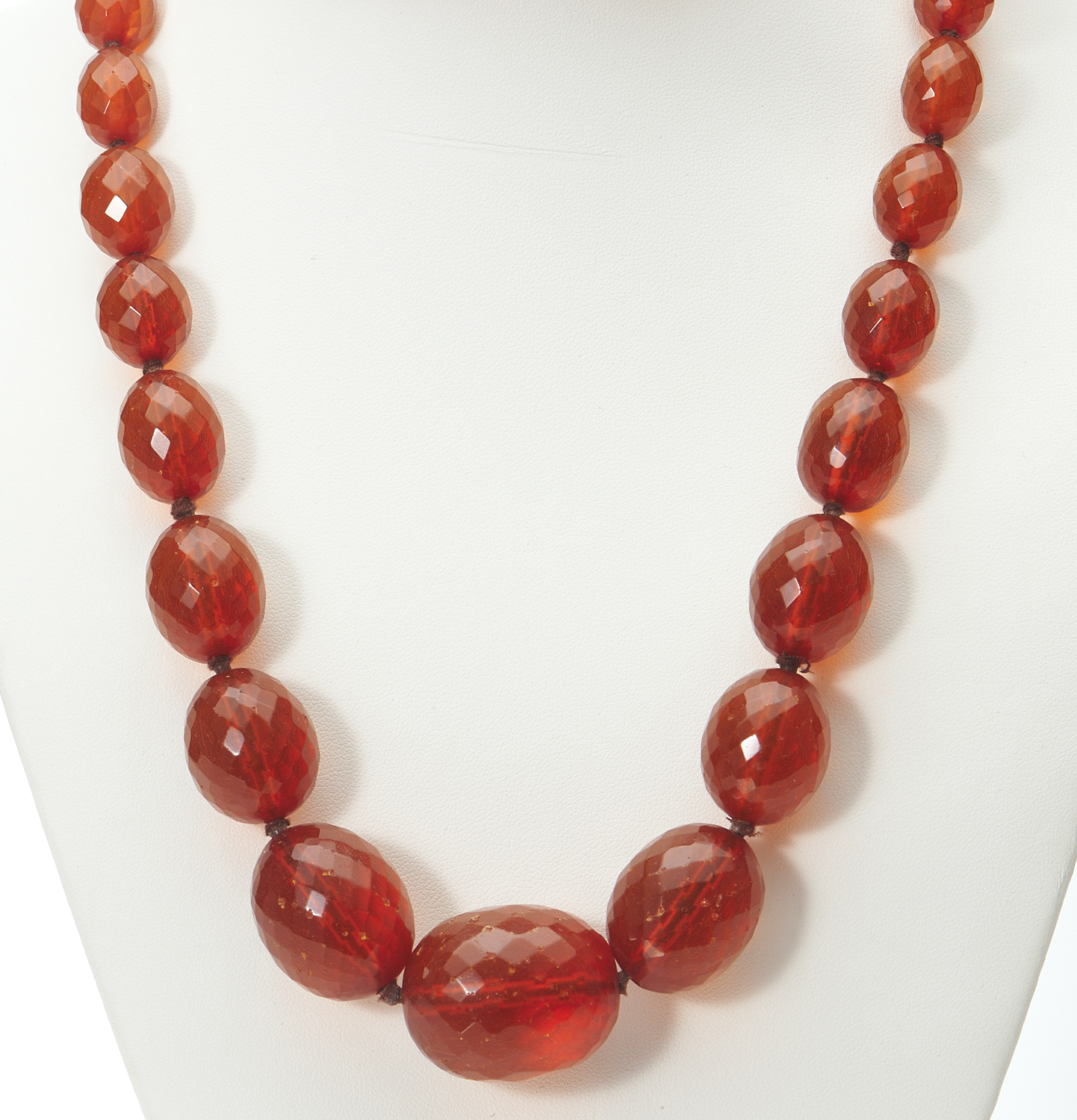 A STRAND OF AMBER COLOURED FACETED BAKELITE BEADS, LENGTH 84CMS