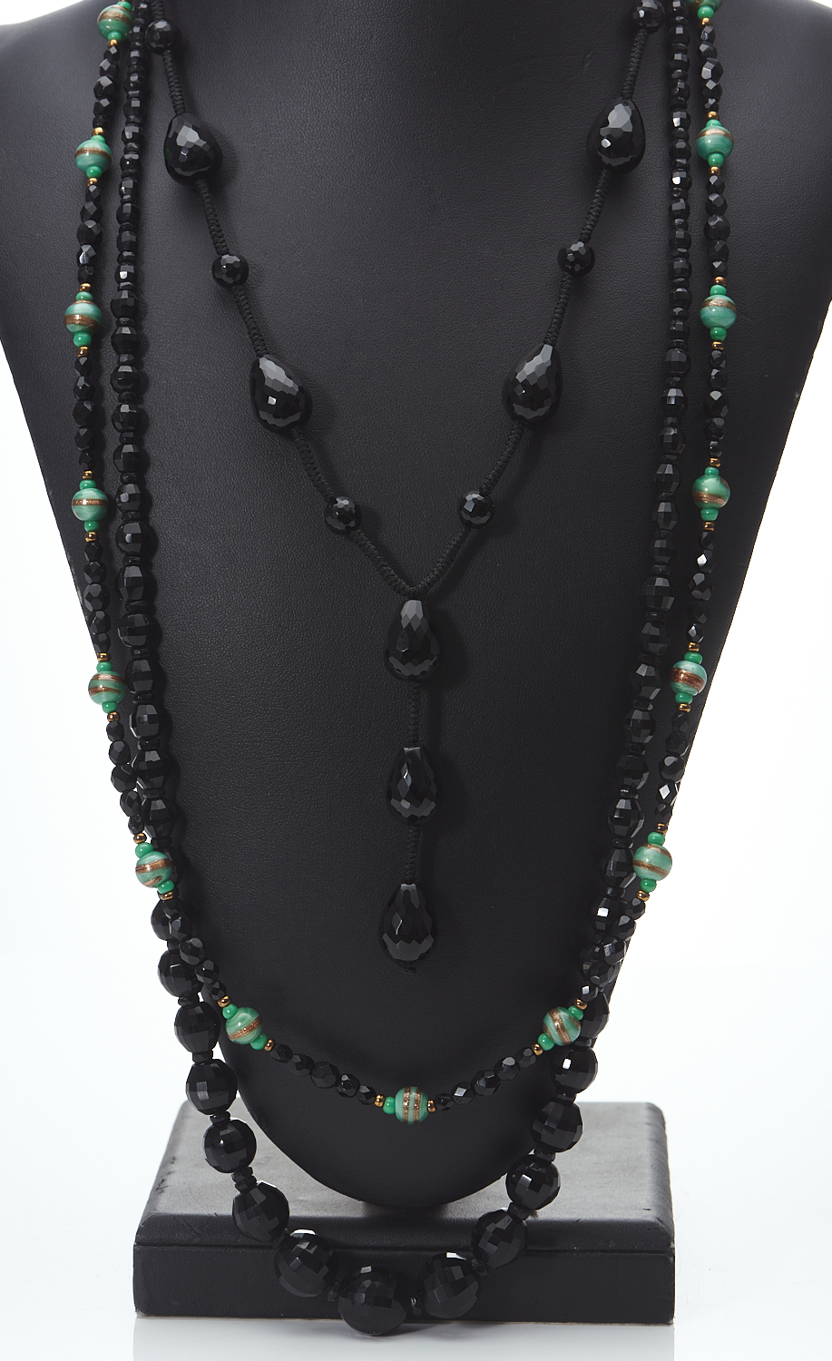 THREE STRANDS OF FRENCH JET, ONE WITH GREEN MURANO GLASS SPACERS (LENGTH 780MM), ANOTHER THREADED ON AN ADJUSTABLE CORD, THE OTHER A GRADUATED STRAND (LENGTH 820MM )