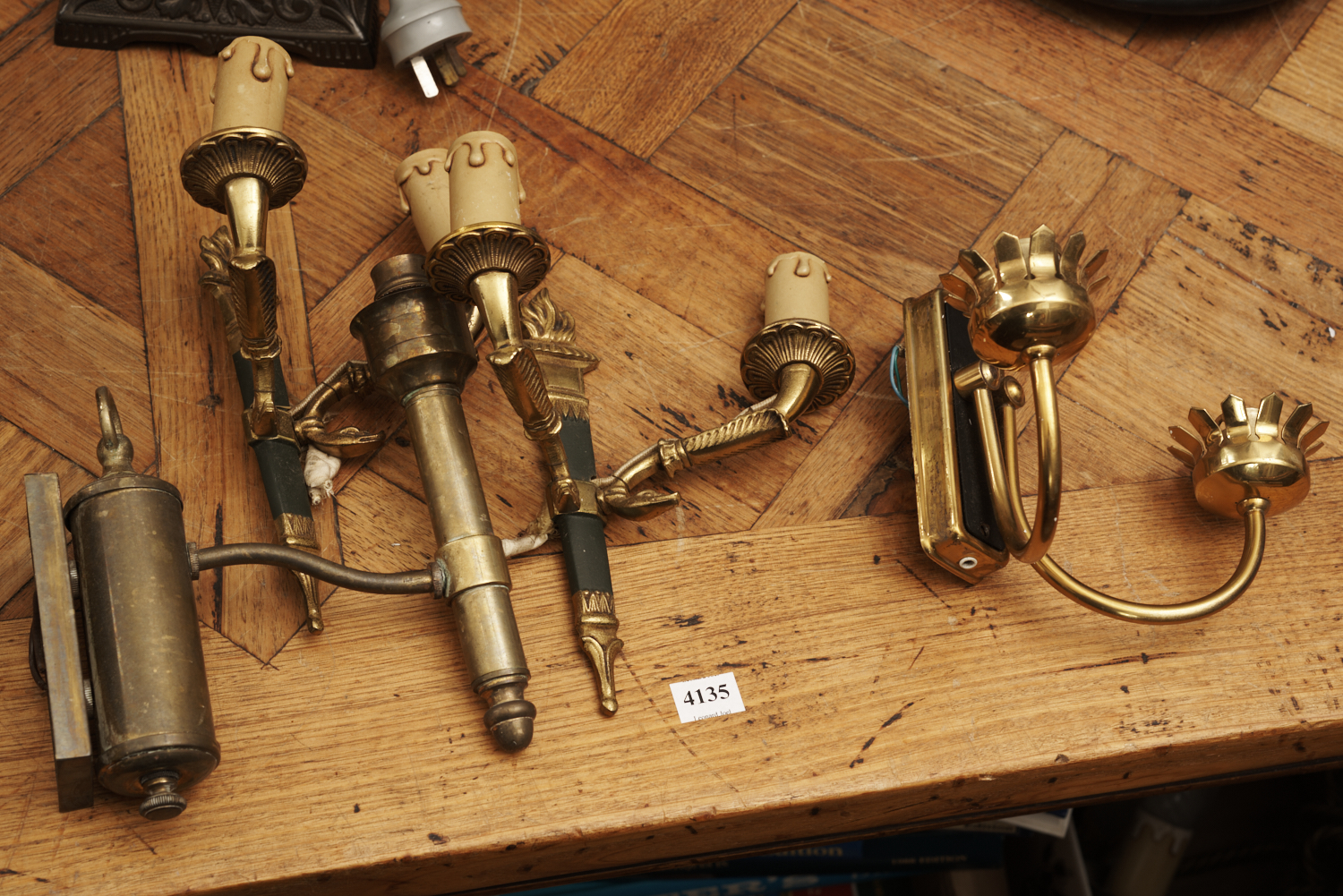A PAIR OF PETITE EMPIRE STYLE WALL SCONCES, AN ART DECO STYLE WALL SCONCE AND A BRASS GASOLIER WALL SCONCE CONVERTED TO ELECTRICITY, LEONARD JOEL LOCAL DELIVERY SIZE: SMALL