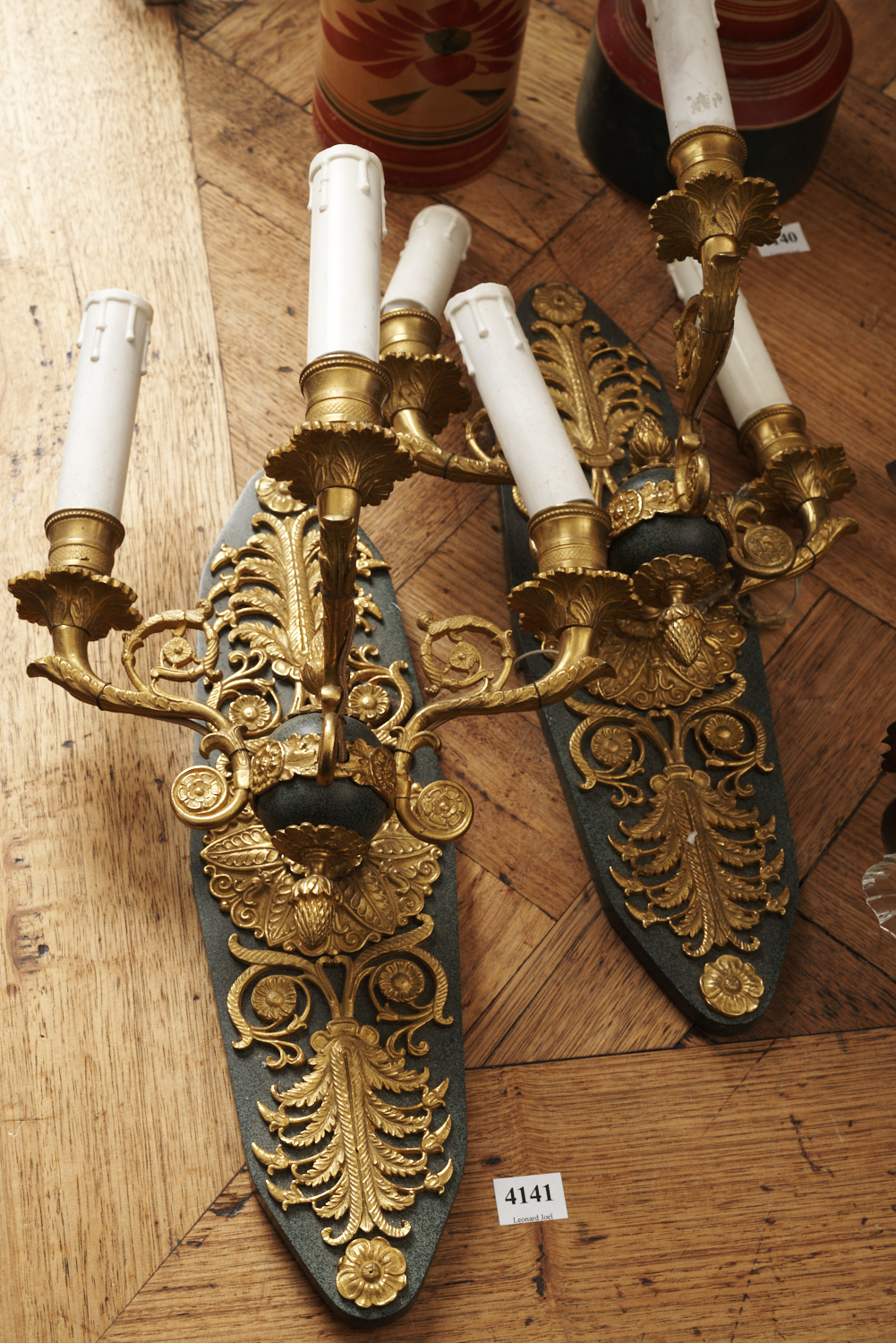 PAIR OF FRENCH DIRECTOIRE MANNER WALL SCONCES C.1950'S ONE WITH BROKEN ARM, H.44CM, LEONARD JOEL LOCAL DELIVERY SIZE: SMALL