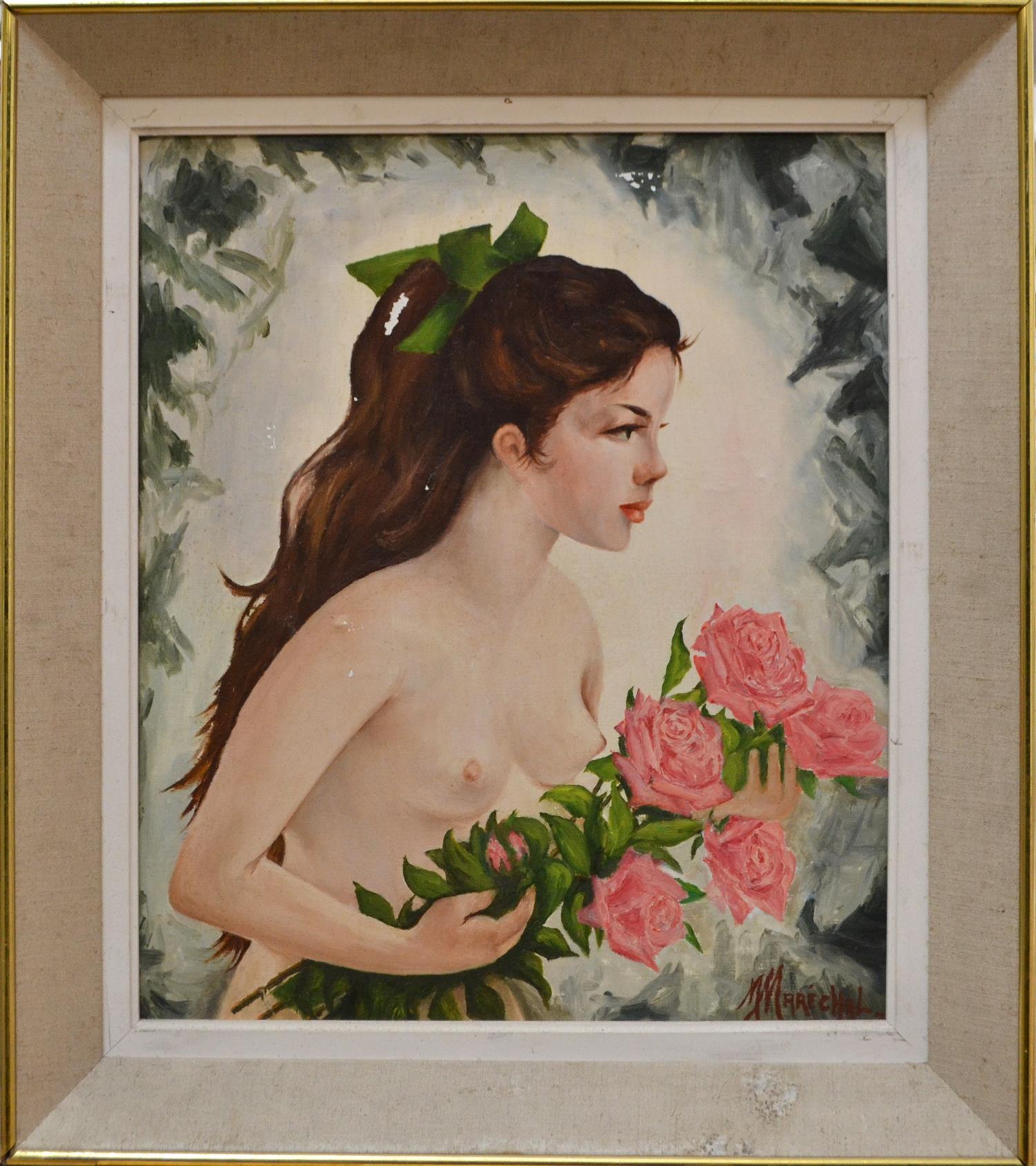 M MARECHAL, GIRL WITH ROSES, OIL ON CANVAS, 54 X 45CM, FRAME SIZE: 69 X 60CM, CONDITION: LOSSES TO PIGMENT, EVIDENT IN HAIR AND BACKGROUND, FLYSPOTTING ACROSS SURFACE, FRAME AND MOUNT IN POOR CONDITION
