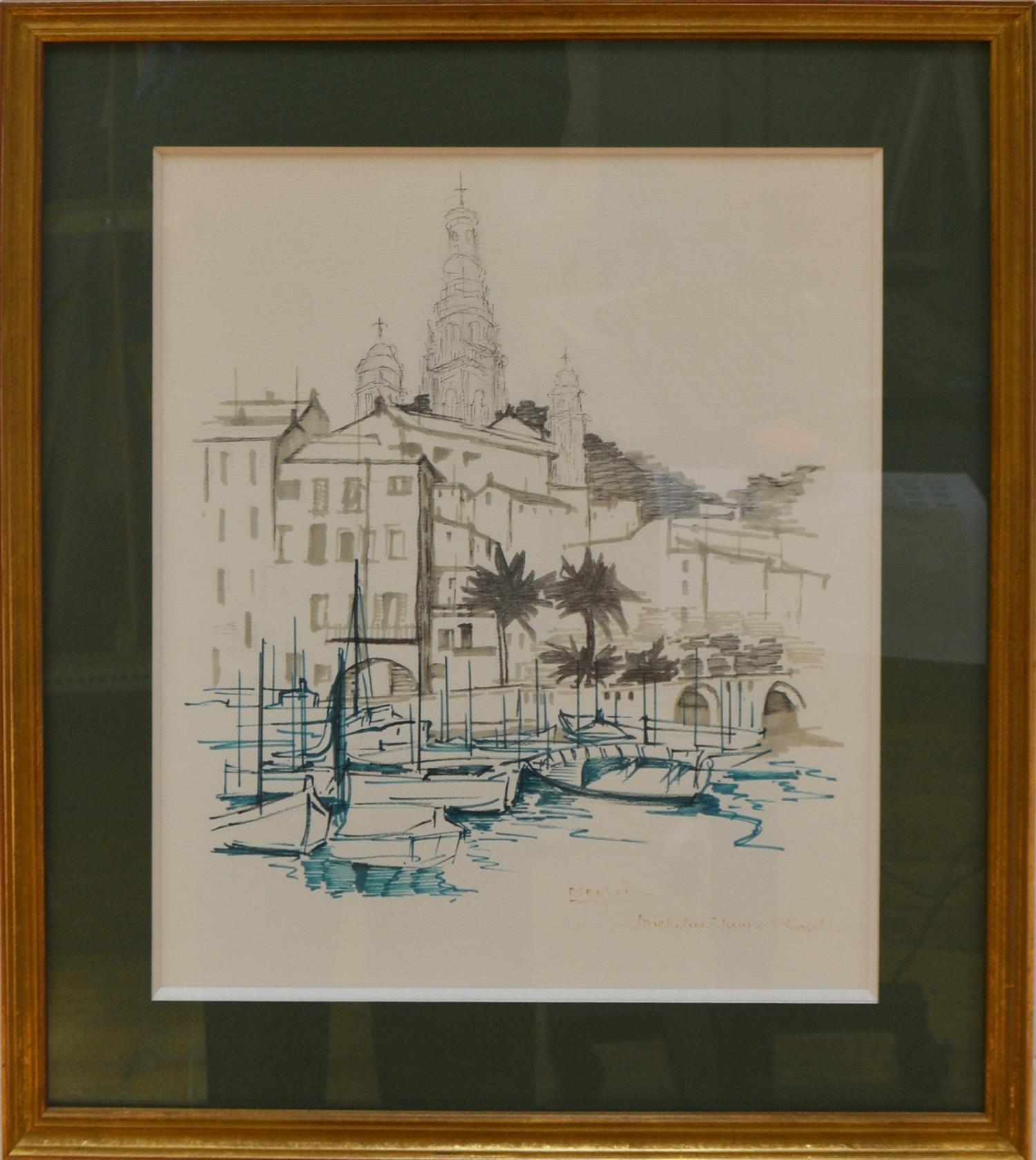 MICHELINE JAUNE CHIMOT, MENTON, INK ON PAPER, 40 X 34CM, FRAME SIZE: 55 X 50CM, CONDITION: GOOD, LEONARD JOEL DELIVERY SIZE: SMALL