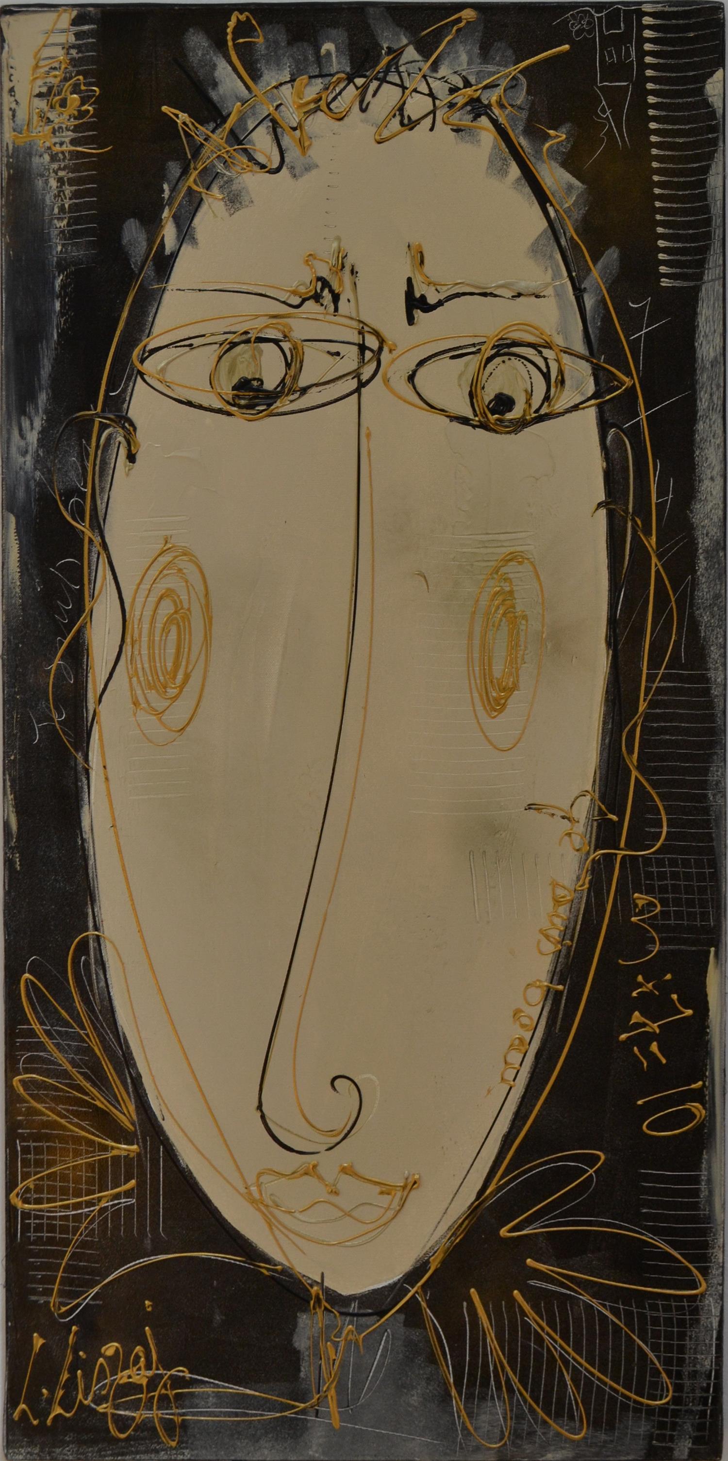 ARTIST UNKNOWN, FACE WITH GOLD, DIGITAL PRINT WITH ACRYLIC DETAILING, 100 X 50CM, NO ADDITIONAL FRAMING, CONDITION: WEAR TO SURFACE AND DARK MARKS AROUND FACE, LEONARD JOEL DELIVERY SIZE: MEDIUM