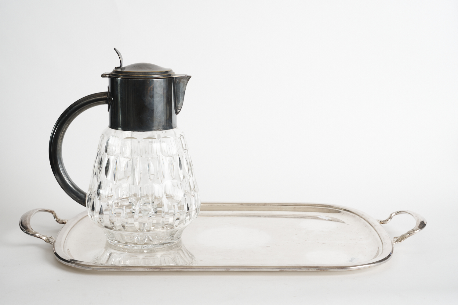 VINTAGE FRENCH CRYSTAL WATER SET WITH SILVER PLATED SERVING TRAY, LEONARD JOEL LOCAL DELIVERY SIZE: SMALL
