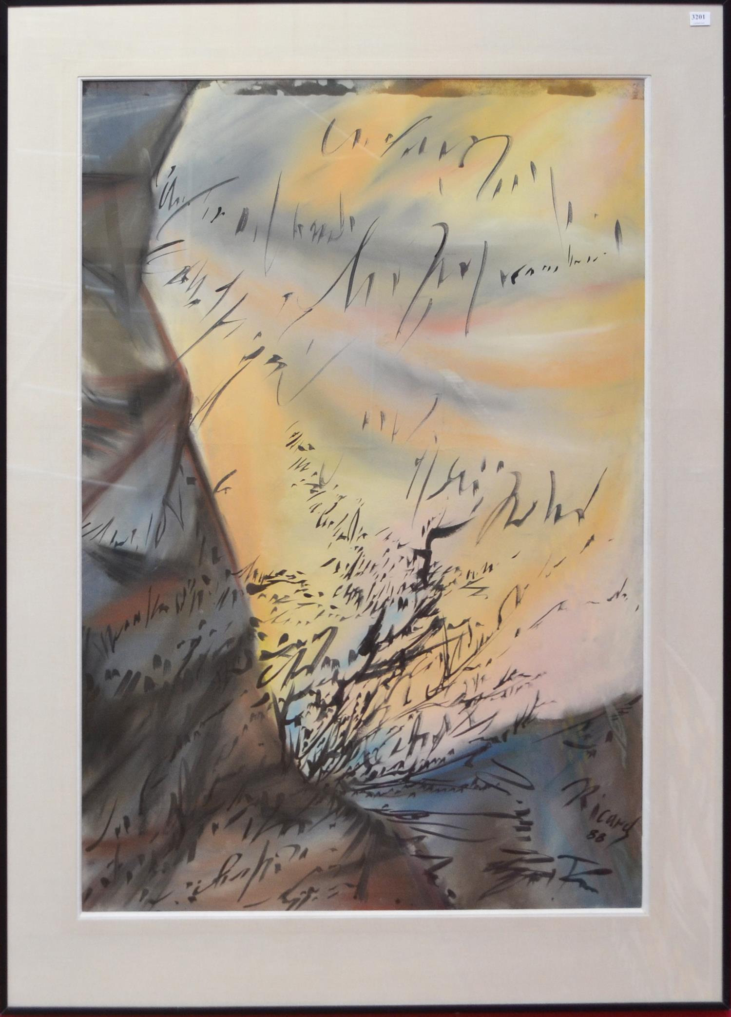 SIGNED RICARD, ABSTRACT 1988, INK AND PASTEL ON PAPER, 109 X 74CM, FRAME SIZE: 133 X 96CM. CONDITION: STAINING SEEN ACROSS TOP OF WORK, PASTEL HAS RUBBED ONTO GLASS