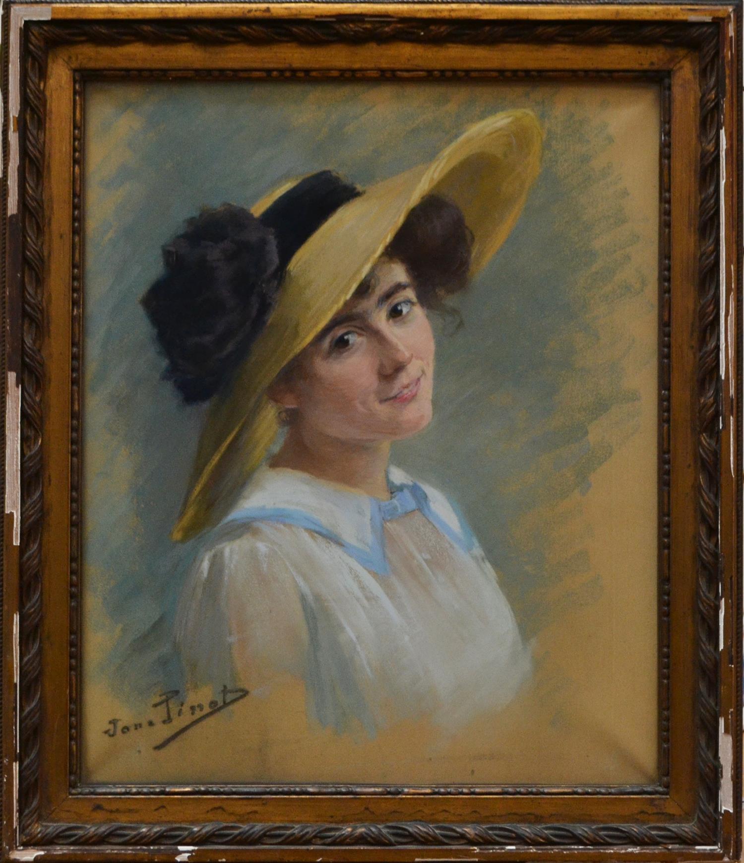 J. PINOT, WOMAN IN HAT, PASTEL ON PAPER, 60 X 48CM, FRAME SIZE: 74 X 62CM