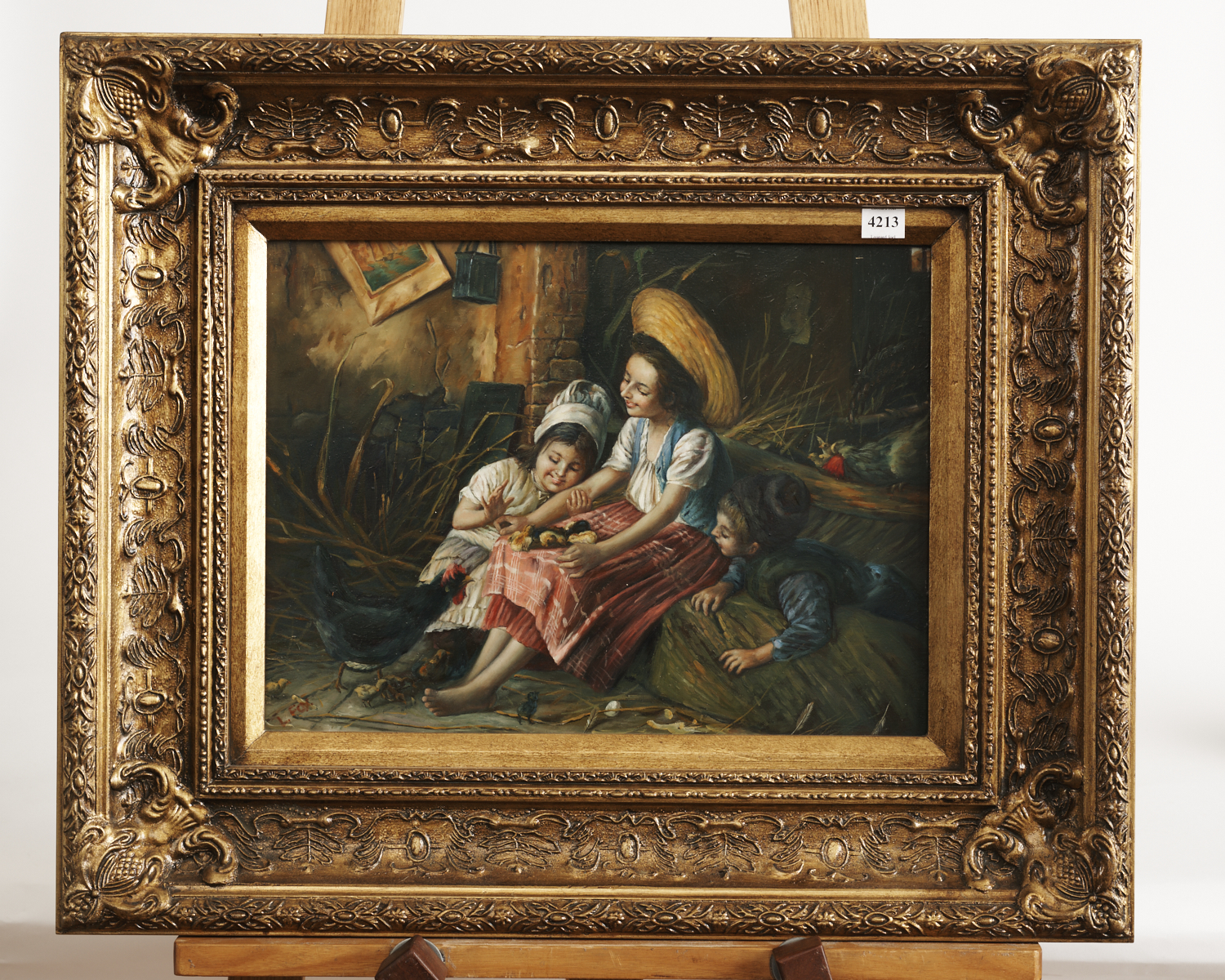 PAINTING OF THREE GIRLS IN GILT FRAME, 30 X 40CM, LEONARD JOEL LOCAL DELIVERY SIZE: SMALL