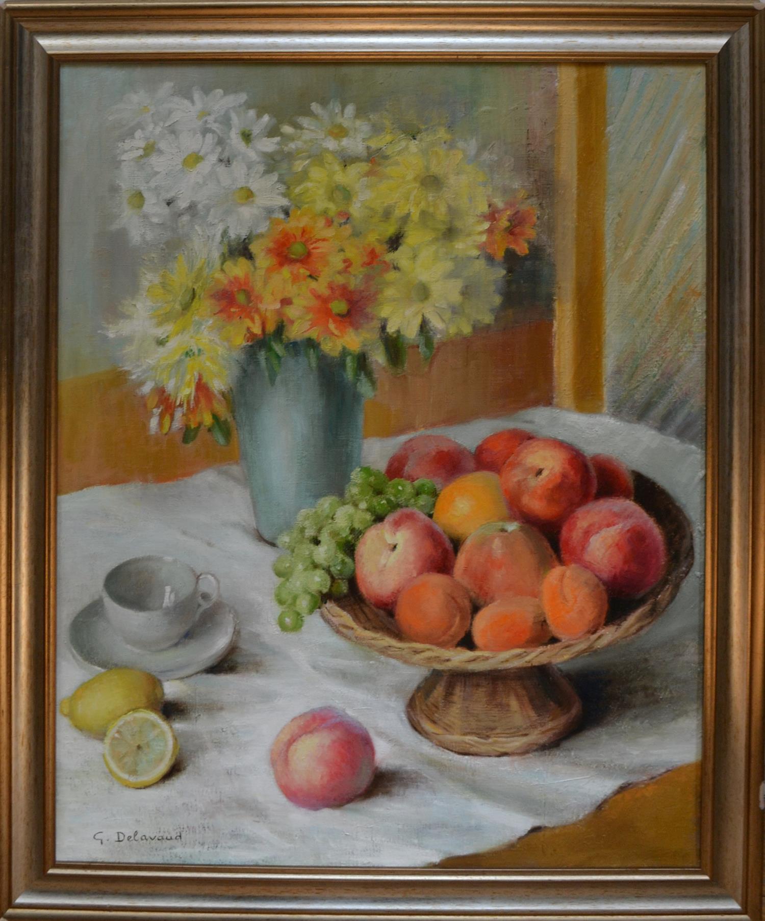 G. DELAVAUD, STILL LIFE WITH PEACHES AND GRAPES, OIL ON CANVAS, 80 X 64CM, FRAME: 92 X 76CM, CONDITION: VERY GOOD CONDITION NO MAJOR FAULTS TO REPORT, LEONARD JOEL DELIVERY SIZE: MEDIUM