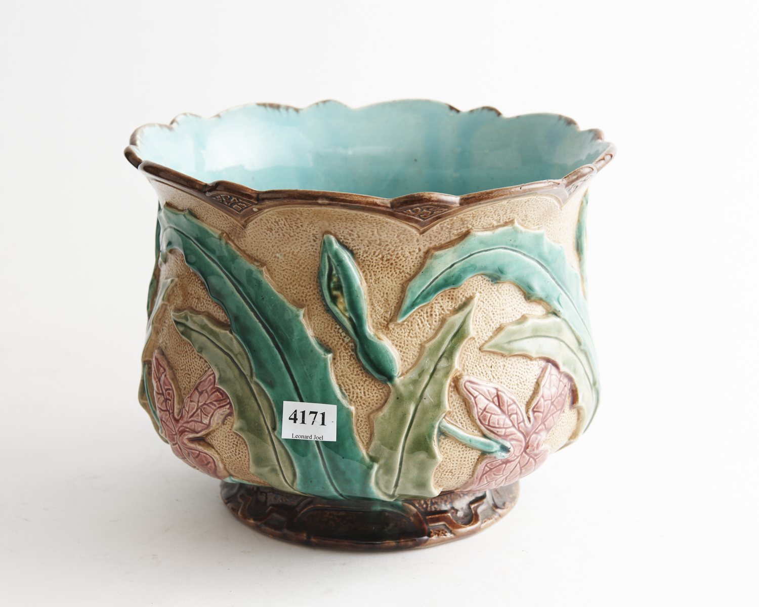 A MAJOLICA GLAZED JARDINIERE H.19CM, LEONARD JOEL LOCAL DELIVERY SIZE: SMALL