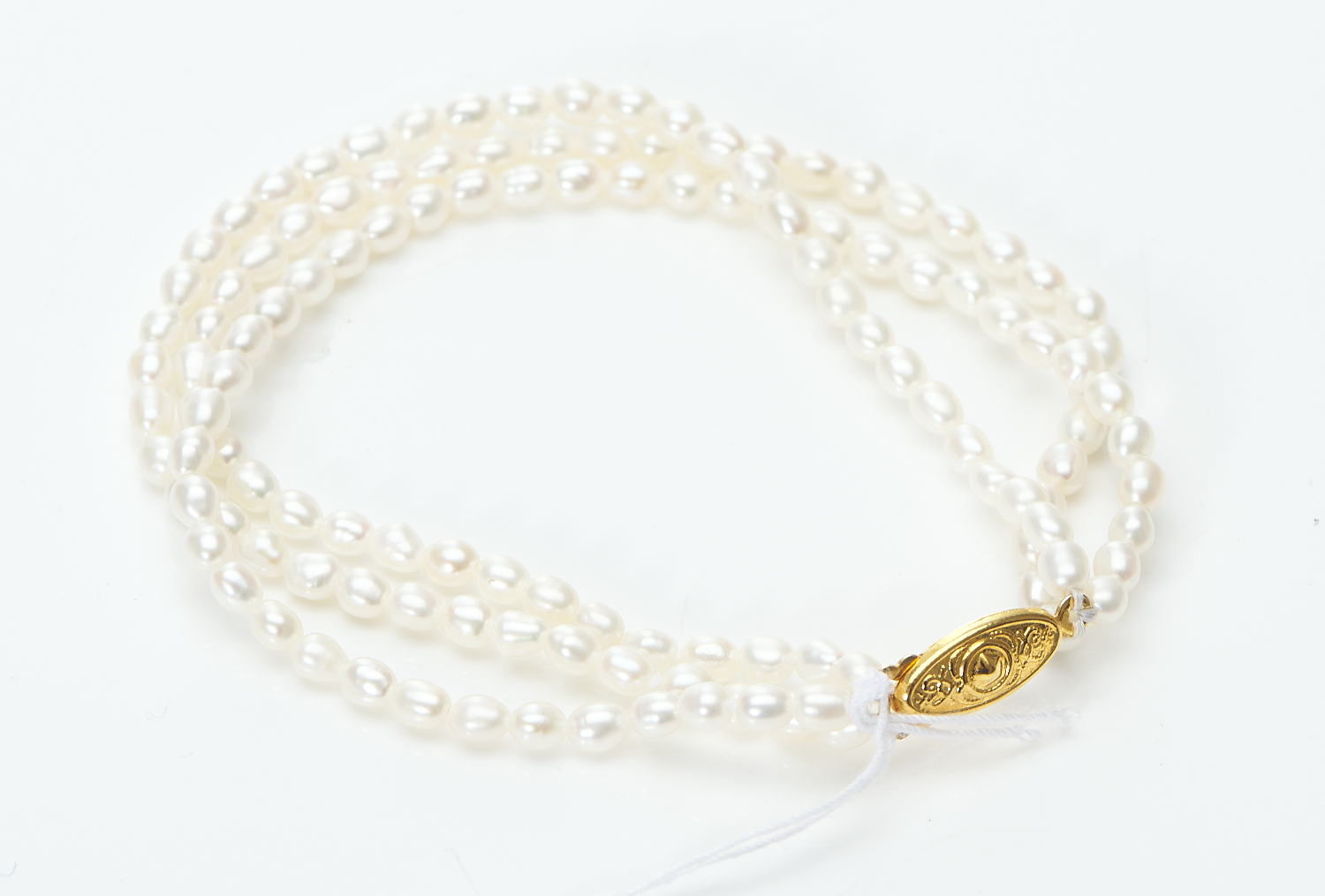 A TRIPLE STRAND FRESHWATER PEARL BRACELET, TO A GOLD PLATED CLASP, TOTAL LENGTH 19CM