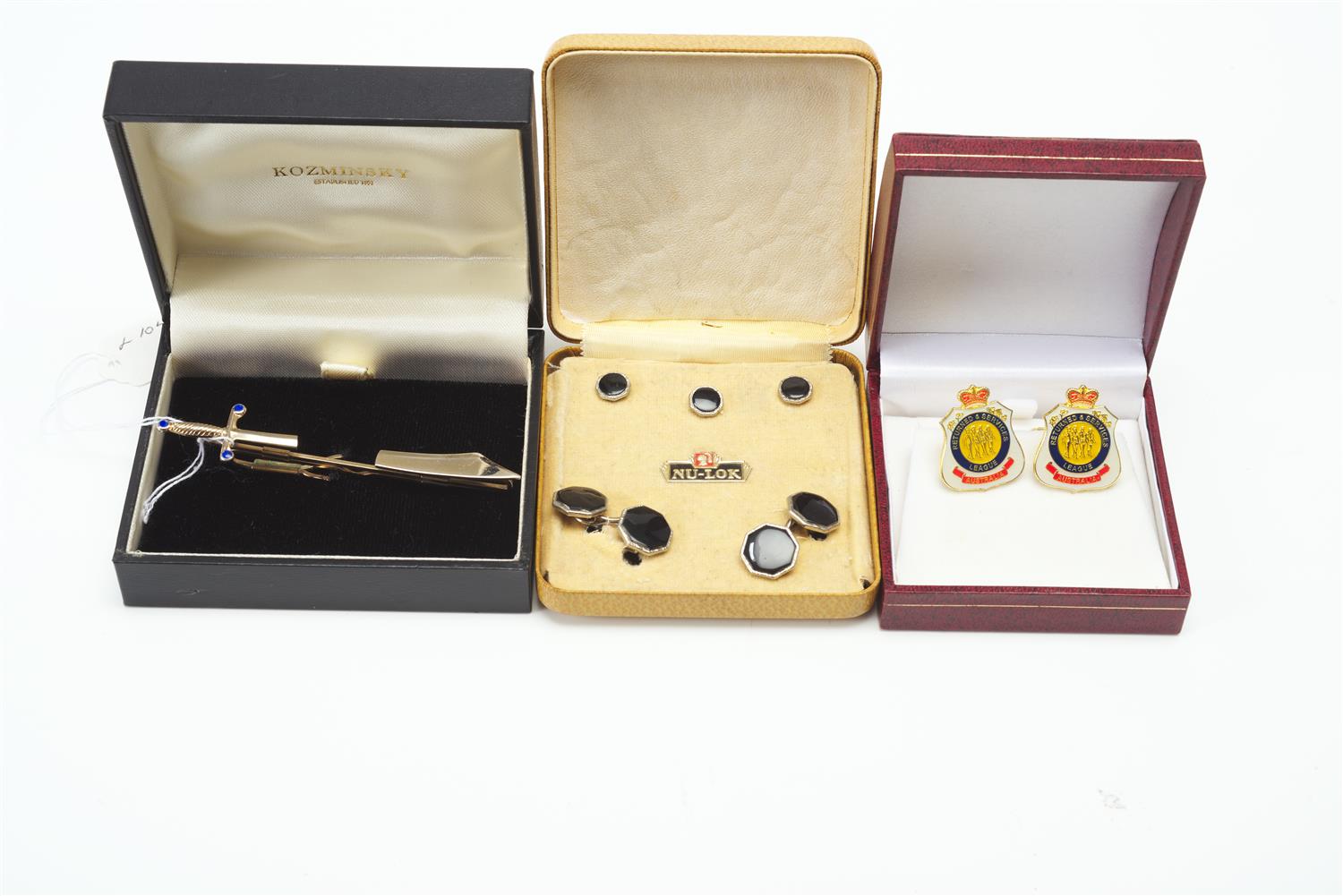 GENTLEMAN'S JEWELLERY INCLUDING ENAMELLED 'RETURNED SERVICE LEAGUE' CUFFLINKS, A VINTAGE BOXED CUFFLINK AND SHIRT STUD SET AND A VINTAGE BOXED SCABBARD SWORD TIE BAR.