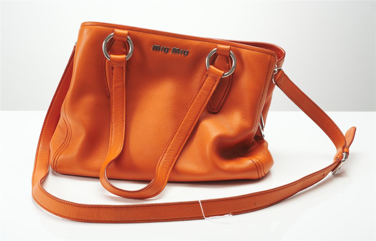 Styled in orange leather with detachable shoulder strap and silver tone metal hardware, 28 x 20 x 10cm.