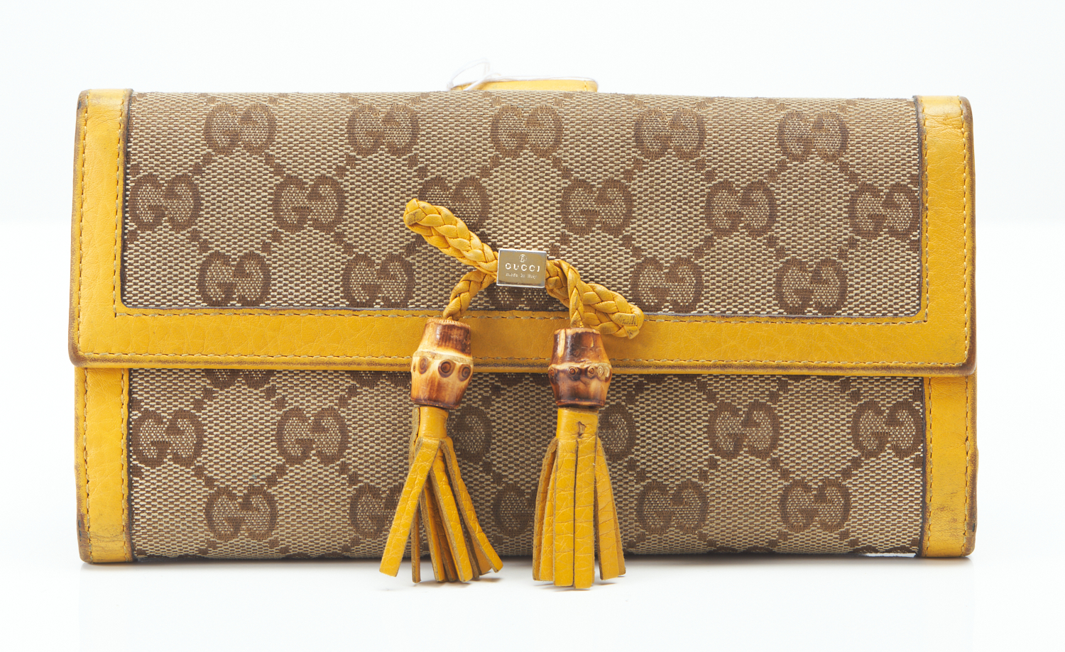 Styled in brown and beige monogram canvas with yellow leather trim, 19 x 10cm.