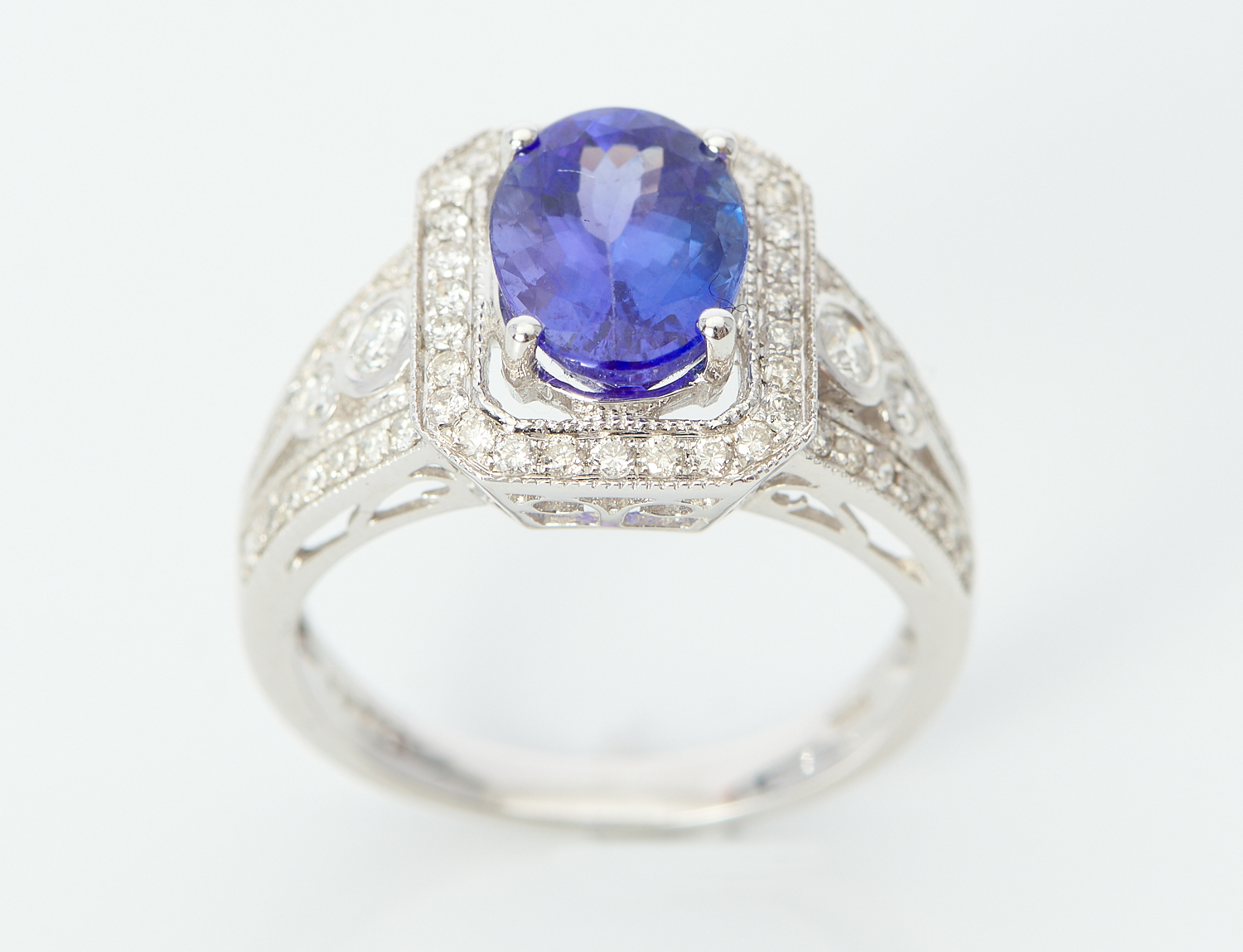 A TANZANITE AND DIAMOND RING Featuring an oval tanzanite weighing 2.47cts, within an octagonal border of round brilliant cut diamonds and split, tapering diamond set shoulders totalling 0.65cts, in 18ct white gold, ring size N, 5.5gms