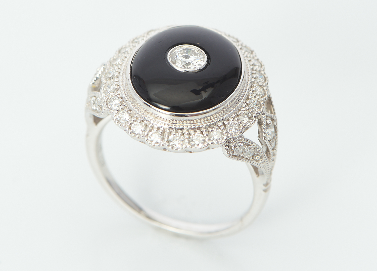AN ONYX AND DIAMOND RING Of Art Deco style, featuring a central round brilliant cut diamond weighing 0.18cts within an oval onyx plaque and decorative diamond set border and shoulders totalling 0.57cts, in 18ct white gold, ring size M.