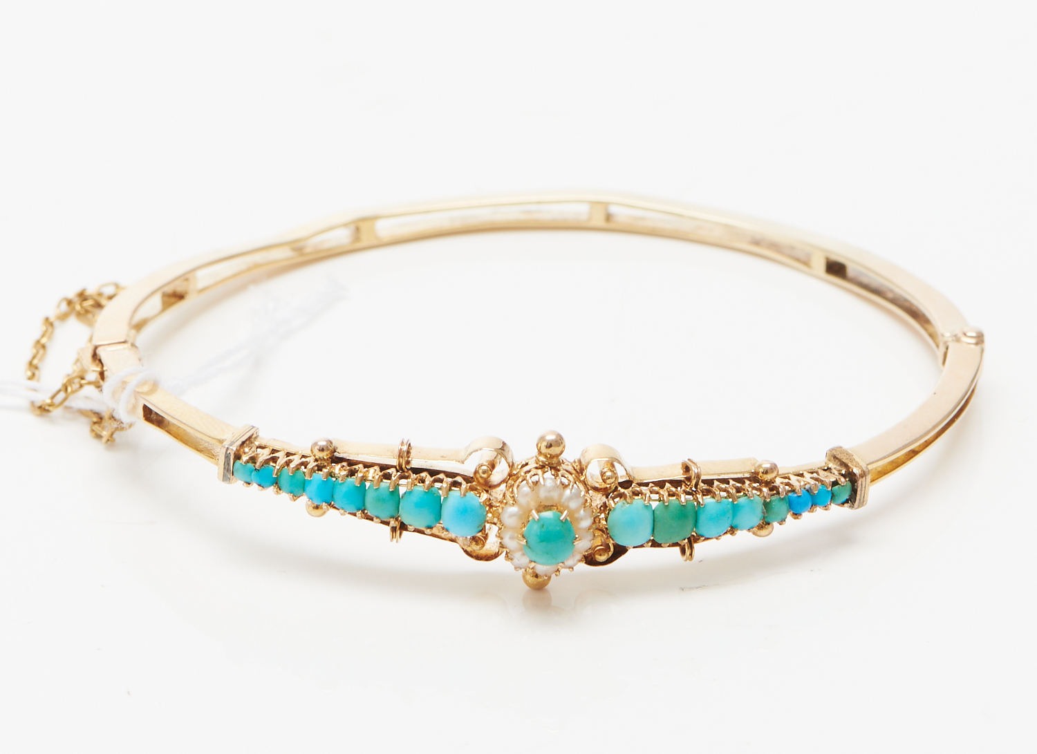 AN EDWARDIAN TURQUOISE AND SEED PEARL BANGLE IN 9CT GOLD, INTERNAL DIAMETER 60MM, 8.7GMS