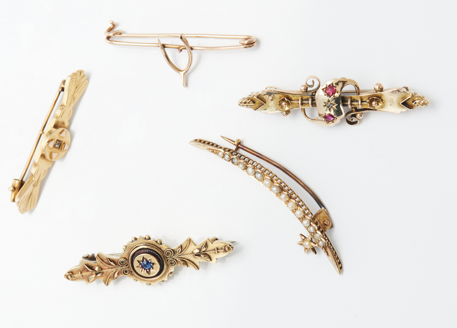 A COLLECTION OF FIVE BROOCHES IN 9CT AND 15CT GOLD, INCLUDING SEED PEARL, DIAMOND AND SAPPHIRE , TOTAL WEIGHT 11.7GMS