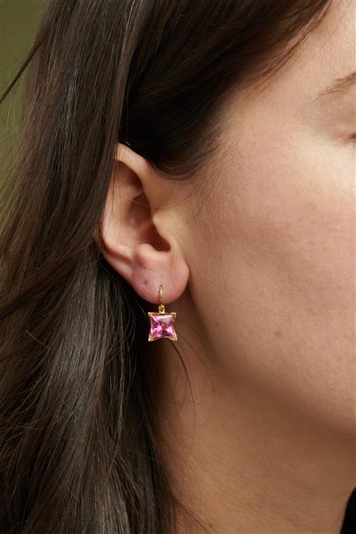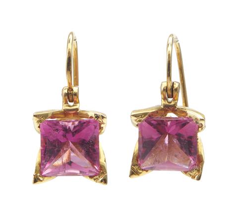 A PAIR OF TOURMALINE EARRINGS BY BARBARA HEATH Each earring comprising a square buff top pink tourmaline weighing 2.93cts, within a floral style four claw setting on European hook fittings, signed, in 18ct gold, circa 2002, retailed by Makers Mark, boxed.