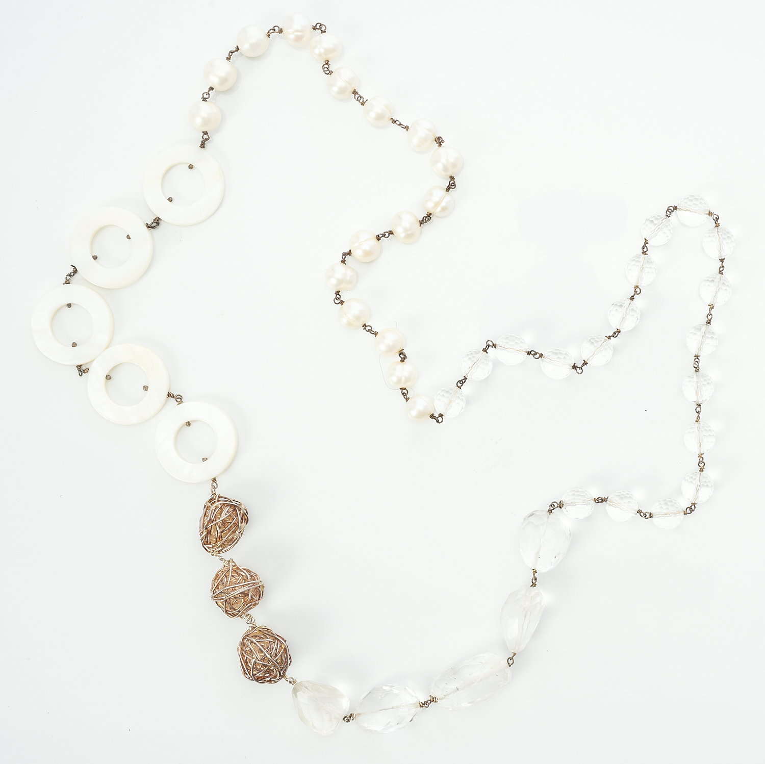 A MOTHER OF PEARL, ROCK CRYSTAL, PEARL AND SILVER NECKLACE BY ELIZABETH BOWER - Of sectional design, comprising mother of pearl circlets, faceted rock crystal beads, freshwater pearls and silver balls, on wire links, circa 2007, retailed by Makers Mark.