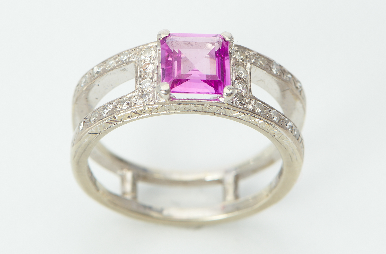 A SAPPHIRE AND DIAMOND RING Featuring a carré cut pink sapphire weighing 1.10cts, flanked by split diamond set shoulders and shank totalling 0.36cts, in platinum and 18ct white gold, ring size M, 5.2GMS