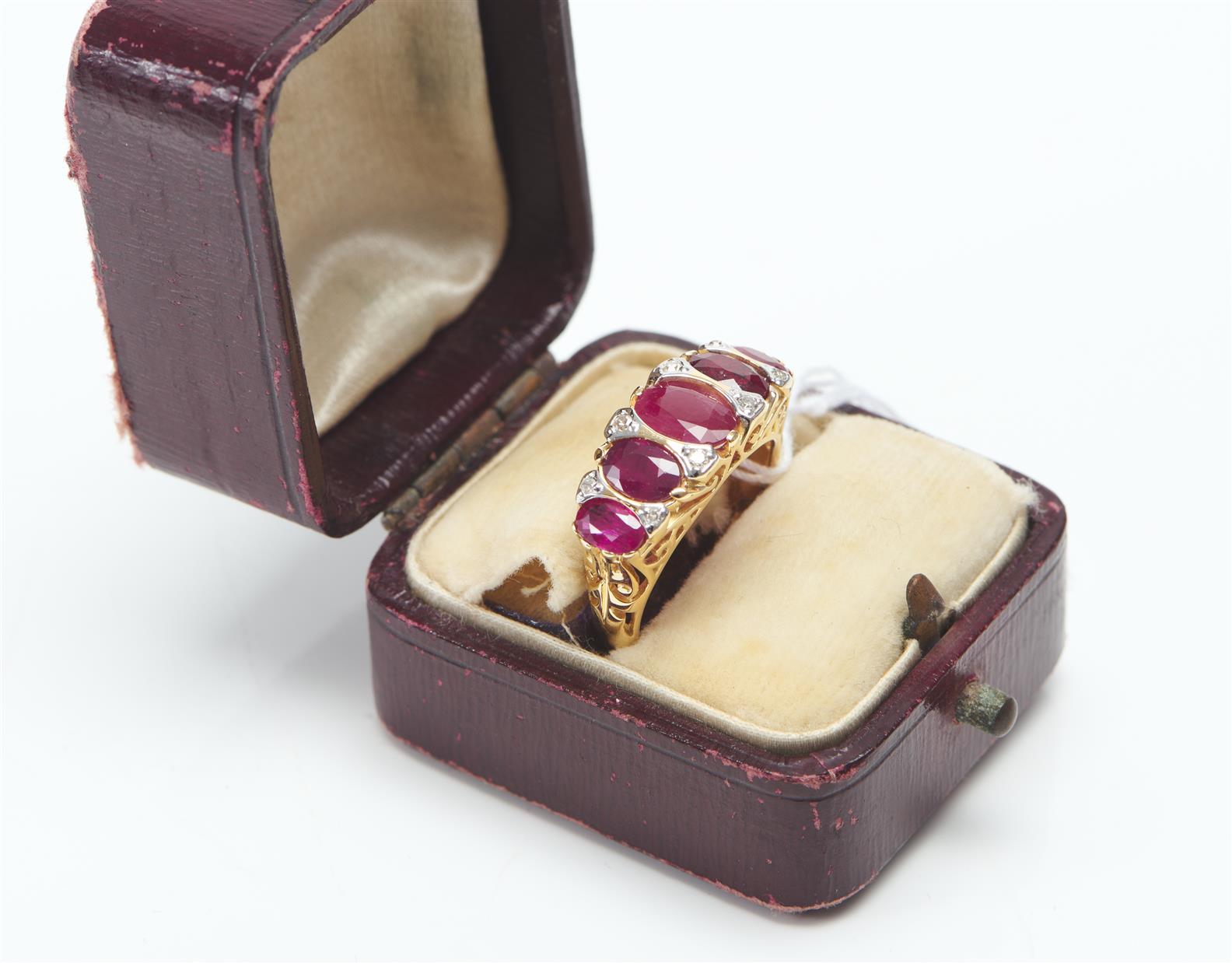 AN ANTIQUE STYLE RUBY AND DIAMOND RING IN 18CT GOLD, FEATURING FIVE OVAL CUT RUBIES TOTALLING 2.37CTS, SPACED WITH DIAMONDS TOTALLING 0.06CT, SIZE K, 4.6GMS
