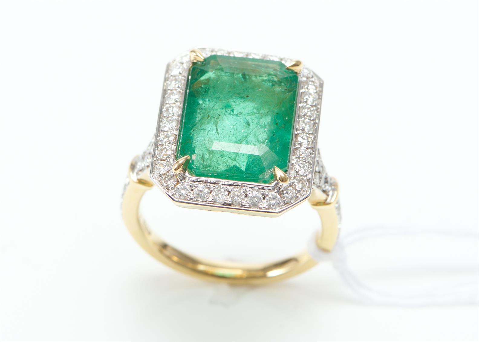 AN EMERALD AND DIAMOND CLUSTER RING IN TWO TONE 18CT GOLD, CENTRALLY SET WITH AN EMERALD CUT EMERALD WEIGHING 6.51CTS, SURROUNDED BY ROUND BRILLIANT CUT DIAMONDS TOTALLING 0.71CT, SIZE M, 7.9GMS