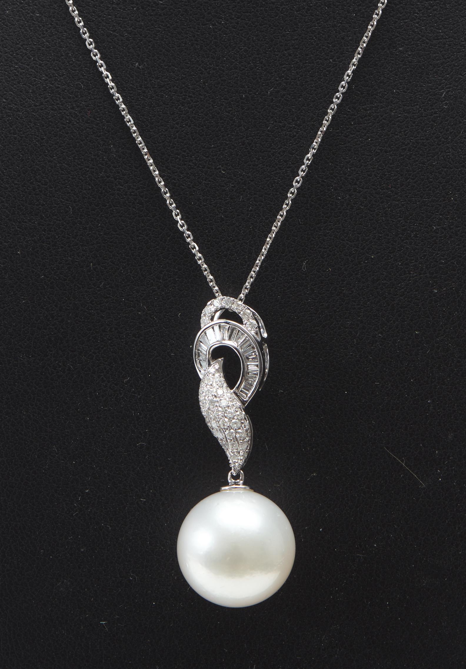 A SOUTH SEA PEARL, MORGANITE AND DIAMOND NECKLACE IN 18CT WHITE GOLD, FEATURING A CUSHION CUT MORGANITE OF 49.44CTS, THE ROUND PEARL...