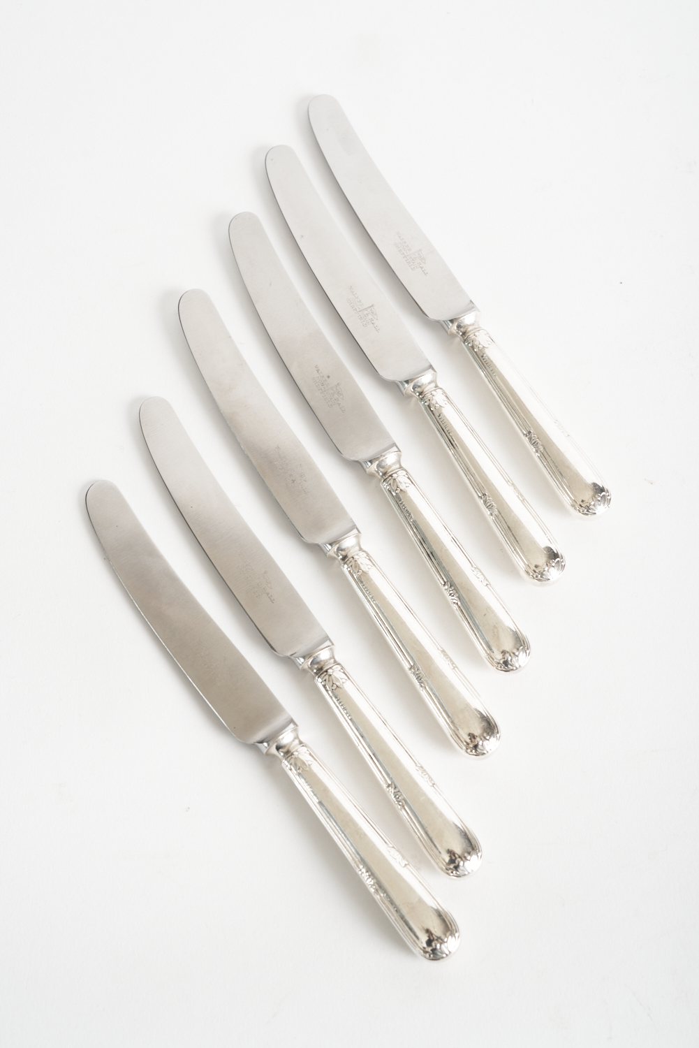 SIX SILVER HANDLED DESSERT KNIVES, LEONARD JOEL LOCAL DELIVERY SIZE: SMALL