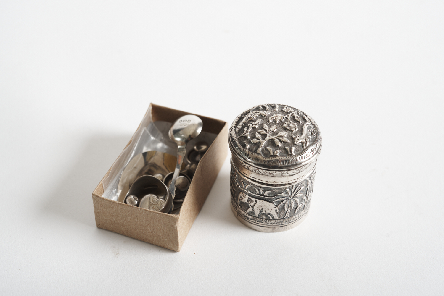 A SILVER TRINKET BOX, TOGETHER WITH A MUSTARD SPOON, CUFFLINKS AND A SILVER RING, LEONARD JOEL LOCAL DELIVERY SIZE: SMALL