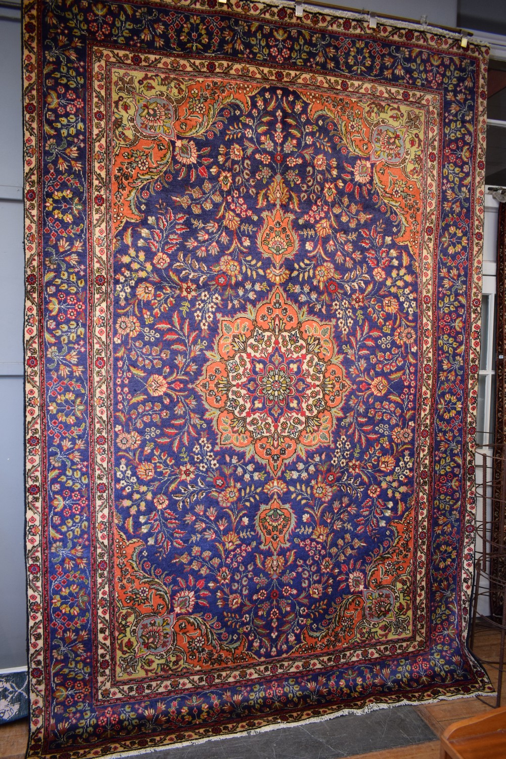 A HAND-KNOTTED PERSIAN ROYAL TABRIZ AZARSHAHR CARPET. 100% DENSE WOOL PILE. CLASSIC TABRIZ DESIGN OF BOLD DOUBLE-CHANDELIER FLORAL MEDALLION & QUARTERED CORNER MEDALLIONS IN A ROYAL BLUE FIELD OF FLORAL SPRAYS. MAJOR BORDER OF FLORAL SPRAYS & TENDRILS. GALLERY EXHIBITED. IN PRISTINE CONDITION. CERTIFICATE OF AUTHENTICITY INCLUDED. SIZE: 330X217CM ORIGIN: PERSIA - RRP: $3,900