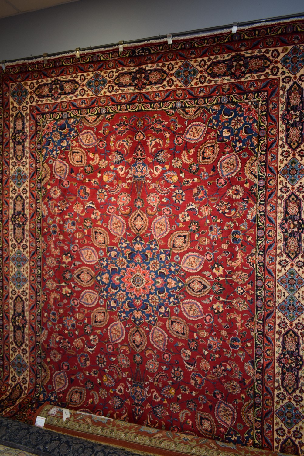 A MAGNIFICENT PERSIAN MASHHAD CARPET. 100% DENSE WOOLEN PILE. FINELY HAND-KNOTTED "SABETKAR" ATELIER WEAVE FROM THE KHORASAN PROVINCE WITH CLASSIC DESIGN OF BOLD SHEIKH SAFI DOUBLE CHANDELIER MEDALLION & QUARTERED CORNER MEDALLIONS IN A CRIMSON FIELD OF PALMETTES & SAZ LEAVES. BORDER OF CARTOUCHE PATTERNS CONTAINING PALMETTES. GALLERY EXHIBITED. IN SUPERB CONDITION. CERTIFICATE OF AUTHENTICITY INCLUDED. SIZE: 392X296CM ORIGIN: PERSIA - RRP: $8,900