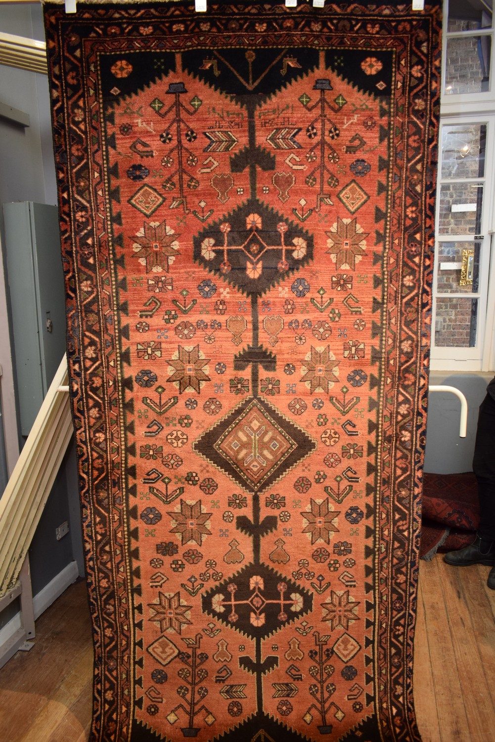 A RARE CIRCA 1970s NOMADIC BIDGANEH (EXTRA-WIDE) HALL RUNNER. 100% HAND-SPUN WOOL. NATURAL DYES. HAND-KNOTTED NOMADIC KURDISH WEAVE WITH TRIBAL DESIGN OF HOOKED GEOMETRIC MEDALLIONS INA FIELD OF FLORAL & TREE OF LIFE PATTERNS AND TRIBAL GUL MOTIFS. INSCRIBED BY WEAVERS "MOHAMMAD & IBRAHIM" & DATED. BORDER OF FLOWER HEADS. WELL-PRESERVED RUG. GALLERY INVENTORY. IN EXCELLENT CONDITION. CERTIFICATE OF AUTHENTICITY INCLUDED. SIZE: 276X120CM ORIGIN: PERSIA - RRP: $3,300
