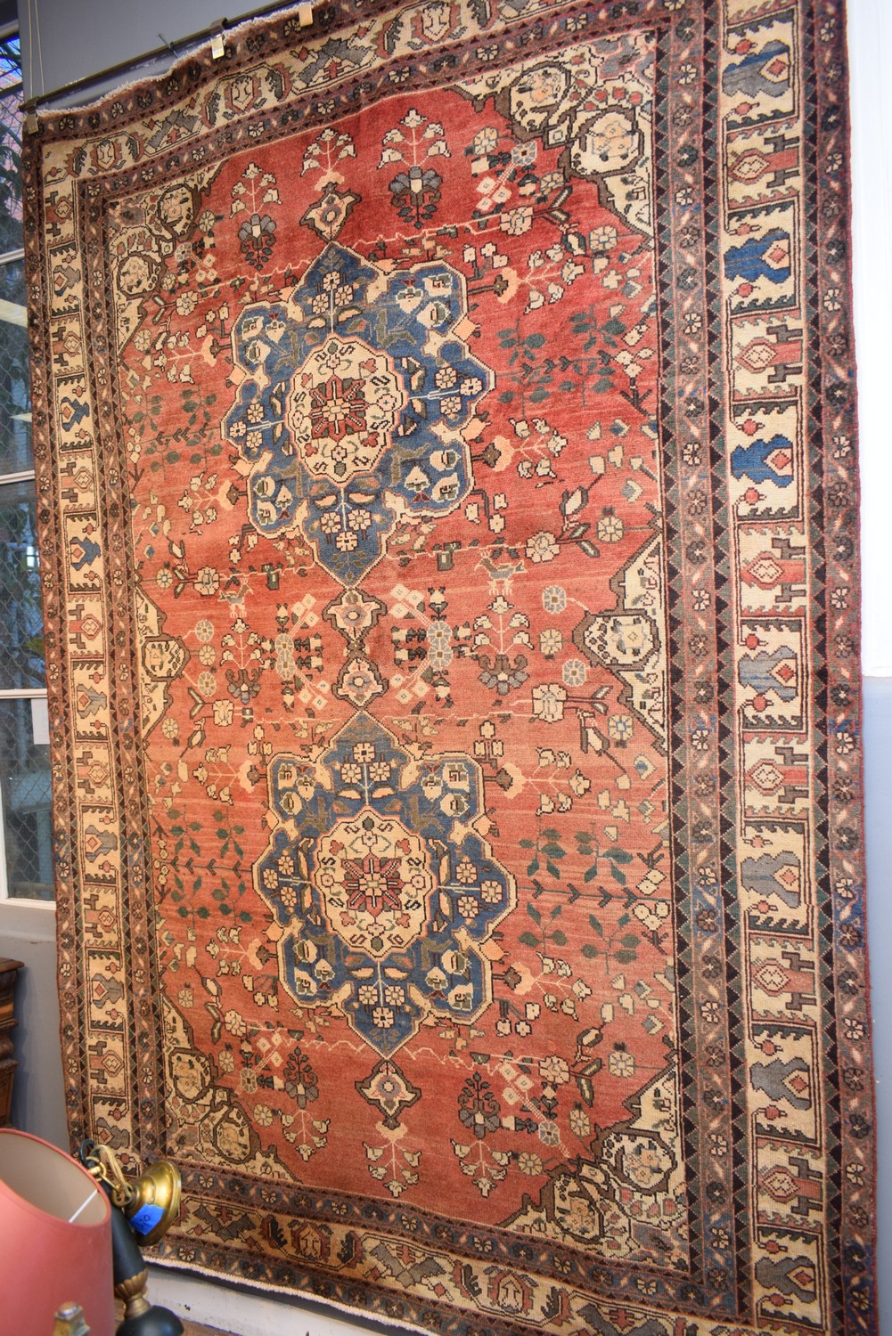 A CIRCA 1970s TRIBAL BAKHTIAR SHALAMZAR RUG, 100% WOOL. NATURAL DYES. HAND-KNOTTED TRIBAL BAKHTIARI WEAVE & DESIGN OF DOUBLE BOULD STYLIZED MEDALLIONS & CORNER MEDALLIONS IN A RED-TONED FIELD OF FLORAL SPRAYS. GEOMETRIC-PATTERNED BORDER. GALLERY INVENTORY. FULLY RESTORED & IN EXCELLENT CONDITION. CERTIFICATE OF AUTHENTICITY INCLUDED. SIZE: 296X203CM ORIGIN: PERSIA - RRP: $2,800