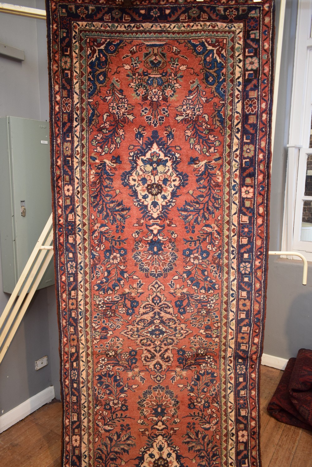 A PERSIAN SAROUQ MAHAL HALL RUNNER, 100% WOOL. DENSE PILE. HAND-KNOTTED VILLAGE WEAVE WITH CLASSIC PERSIAN FLORAL DESIGN OF TRIPLE MEDALLION IN A RED FIELD OF FLORAL SPRAYS. MINOR BORDERS OF FLOWER HEADS. GALLERY INVENTORY. IN EXCELLENT CONDITION. CERTIFICATE OF AUTHENTICITY INCLUDED. SIZE: 335X107CM ORIGIN: PERSIA - RRP: $2,400