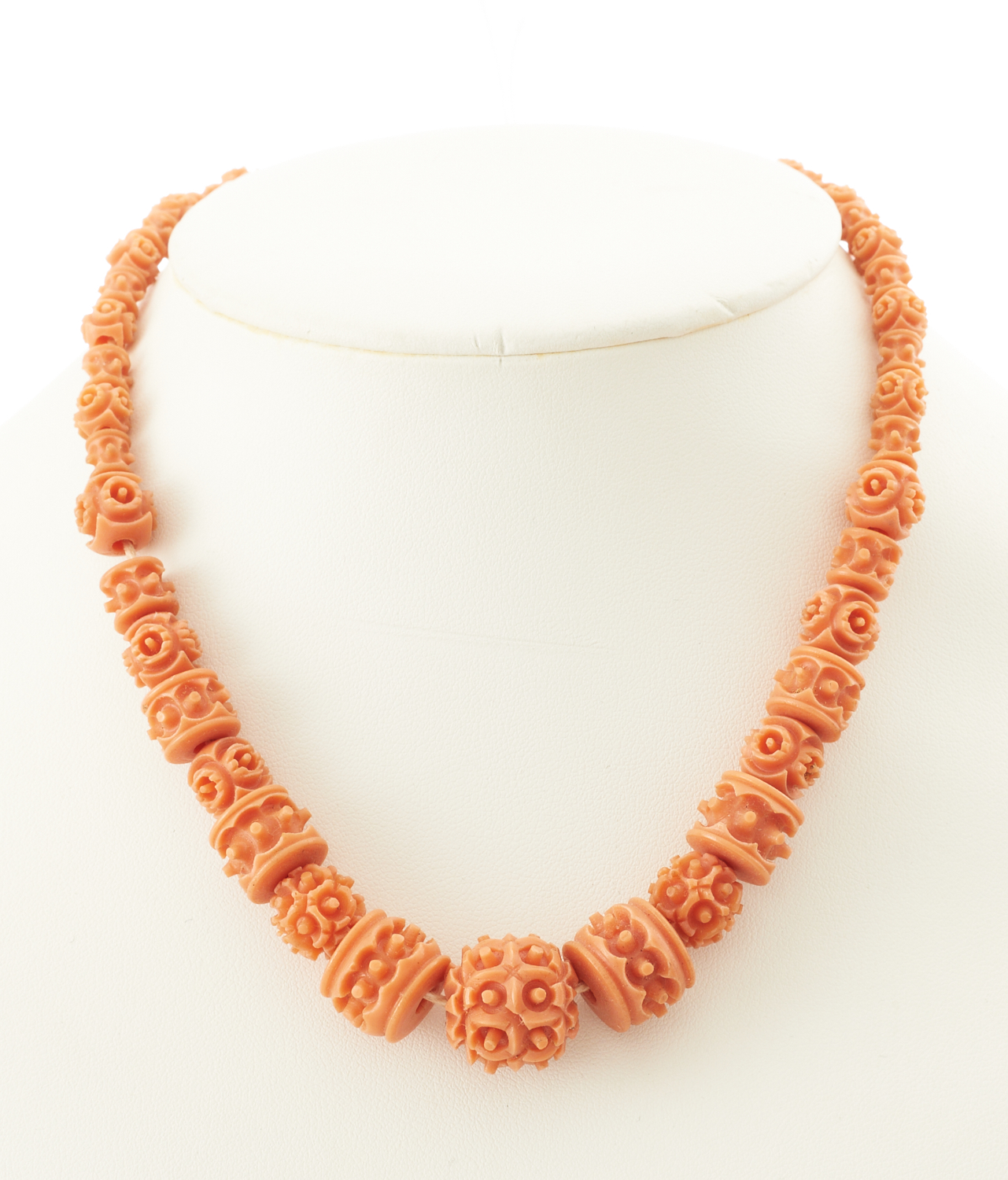 A STRAND OF SCULPTED PINK BAKELITE, TO A SCREW CLASP, LENGTH 40CMS