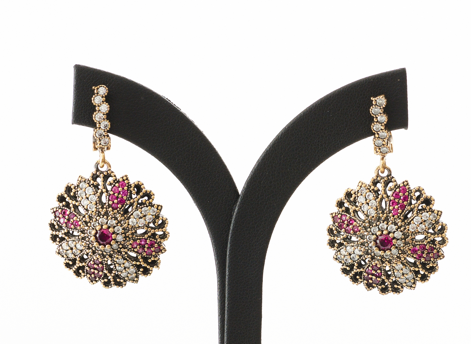 A PAIR OF RED PASTE AND CUBIC ZIRCONIA CIRCULAR EARRINGS IN SILVER GILT, TO LEVER FITTINGS, LENGTH 5CMS