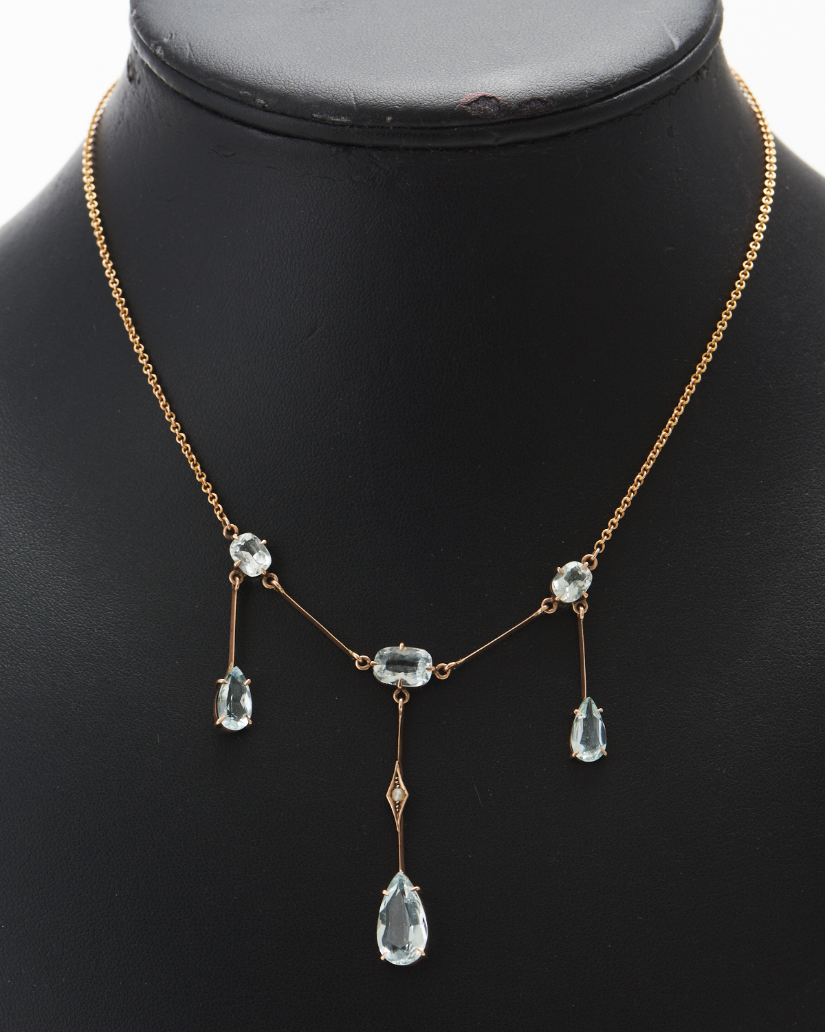 AN EDWARDIAN DROP NECKLACE COMPRISING BLUE PASTE, ACID TESTED 9CT GOLD, LENGTH 38CMS, 5.7GMS