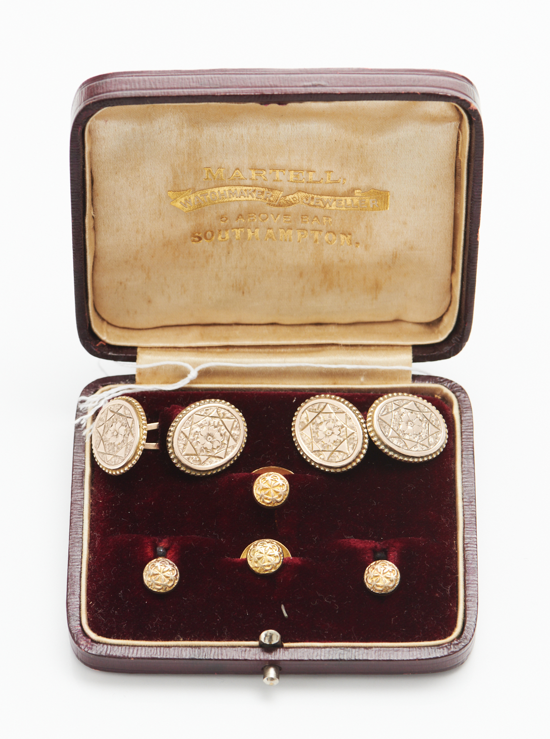 A SET OF EDWARDIAN GOLD LINED CUFFLINKS AND STUDS, BOXED