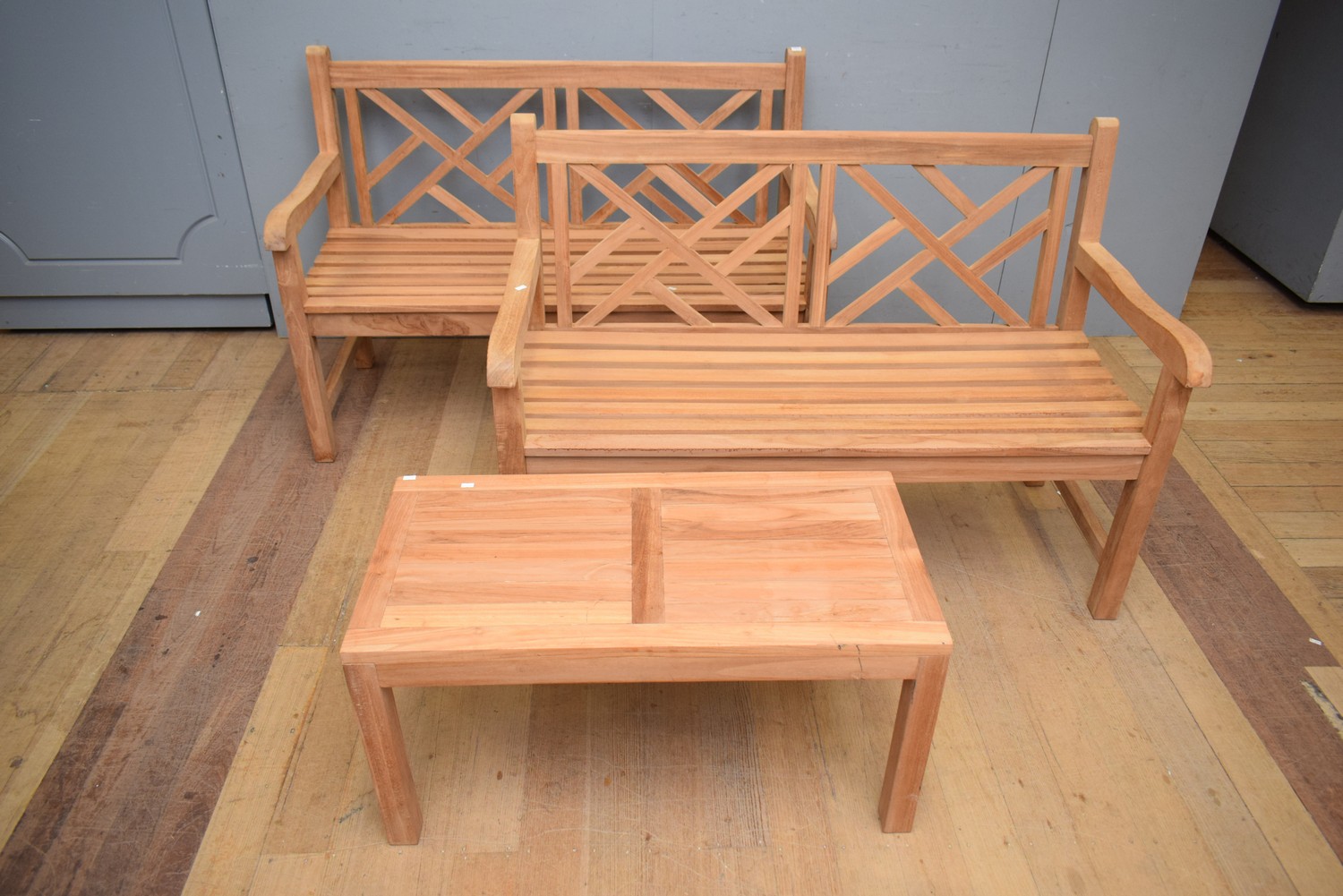 A THREE PIECE TEAK OUTDOOR SETTING ( BENCHES 92H X 131W X 64D CM) (TABLE 45H X 90W X 45D CM) (PLEASE NOTE THIS HEAVY ITEM MUST BE REMOVED BY CARRIERS AT THE CUSTOMER'S EXPENSE. LEONARD JOEL STAFF CANNOT ASSIST CARRYING THIS ITEM) (X-LARGE ITEM)