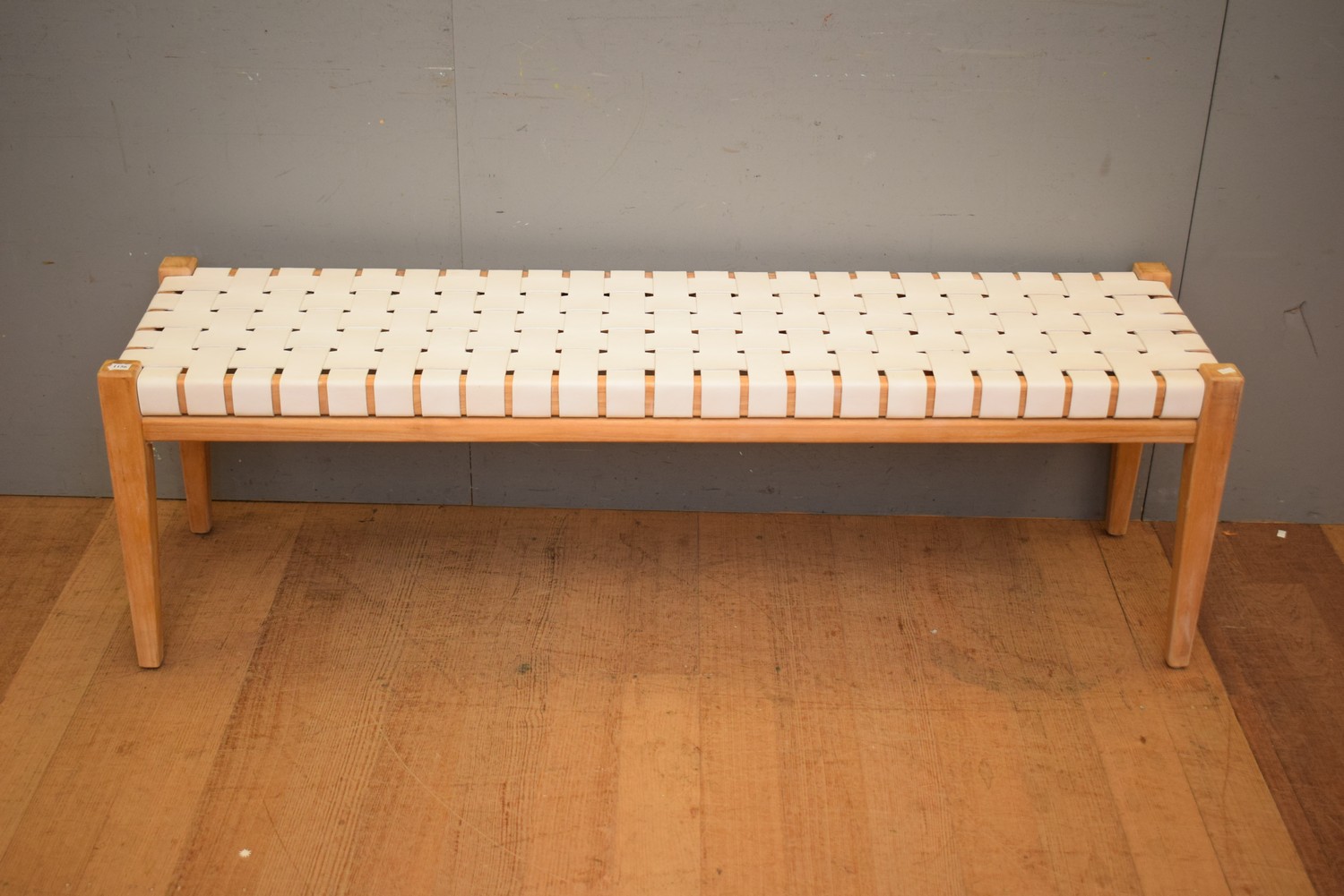 A TEAK AND LEATHER WEAVE BENCH (47H x 150W x 40D CM) (LEONARD JOEL DELIVERY SIZE: MEDIUM)