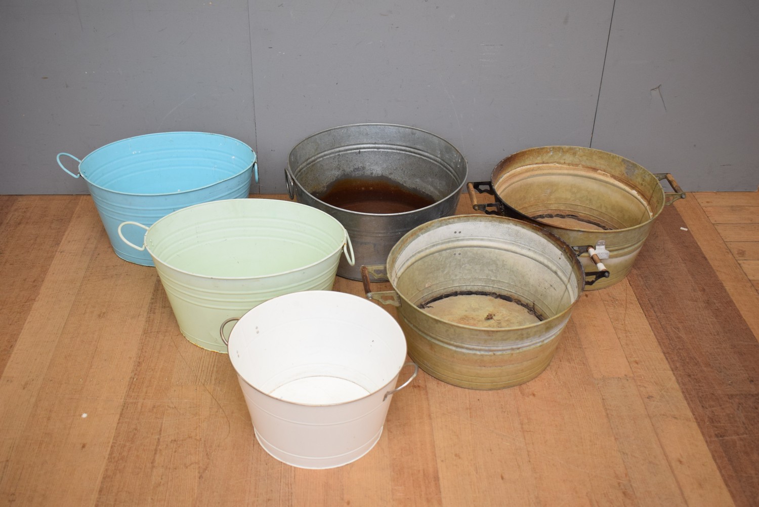 A COLLECTION OF METAL TUBS (LARGEST 28H x 53D CM) (LEONARD JOEL DELIVERY SIZE: MEDIUM)