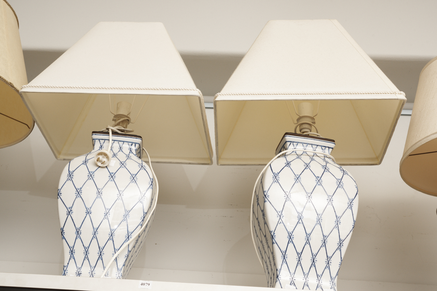 A PAIR OF BLUE AND WHITE TABLE LAMPS, LEONARD JOEL LOCAL DELIVERY SIZE: SMALL