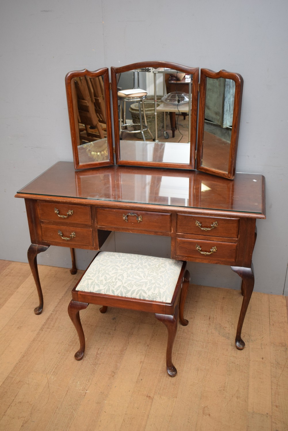 A QUEEN ANNE STYLE SDRESSING TABLE AND STOOL (A/F) (144H X 122W X 56D CM) (PLEASE NOTE THIS HEAVY ITEM MUST BE REMOVED BY CARRIERS AT THE CUSTOMER'S EXPENSE. LEONARD JOEL STAFF CANNOT ASSIST CARRYING THIS ITEM) (X-LARGE ITEM)