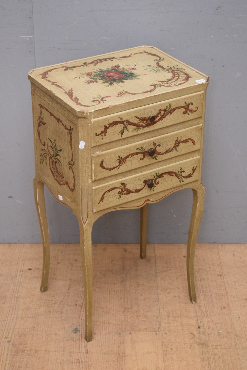 A HANDPAINTED FRENCH THREE DRAWER CABINET (A/F) (73H X 41W X 32D CM) (LEONARD JOEL DELIVERY SIZE: MEDIUM)