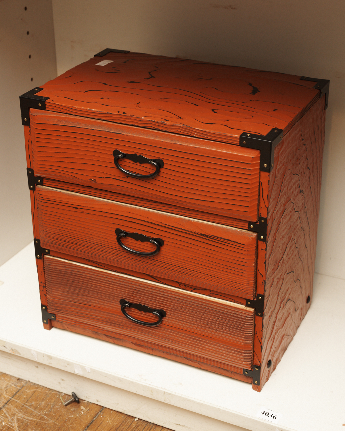 A JAPANESE WOODEN THREE DRAWER SEWING CABINET WITH METAL HANDLES, H.30CM, LEONARD JOEL LOCAL DELIVERY SIZE: SMALL