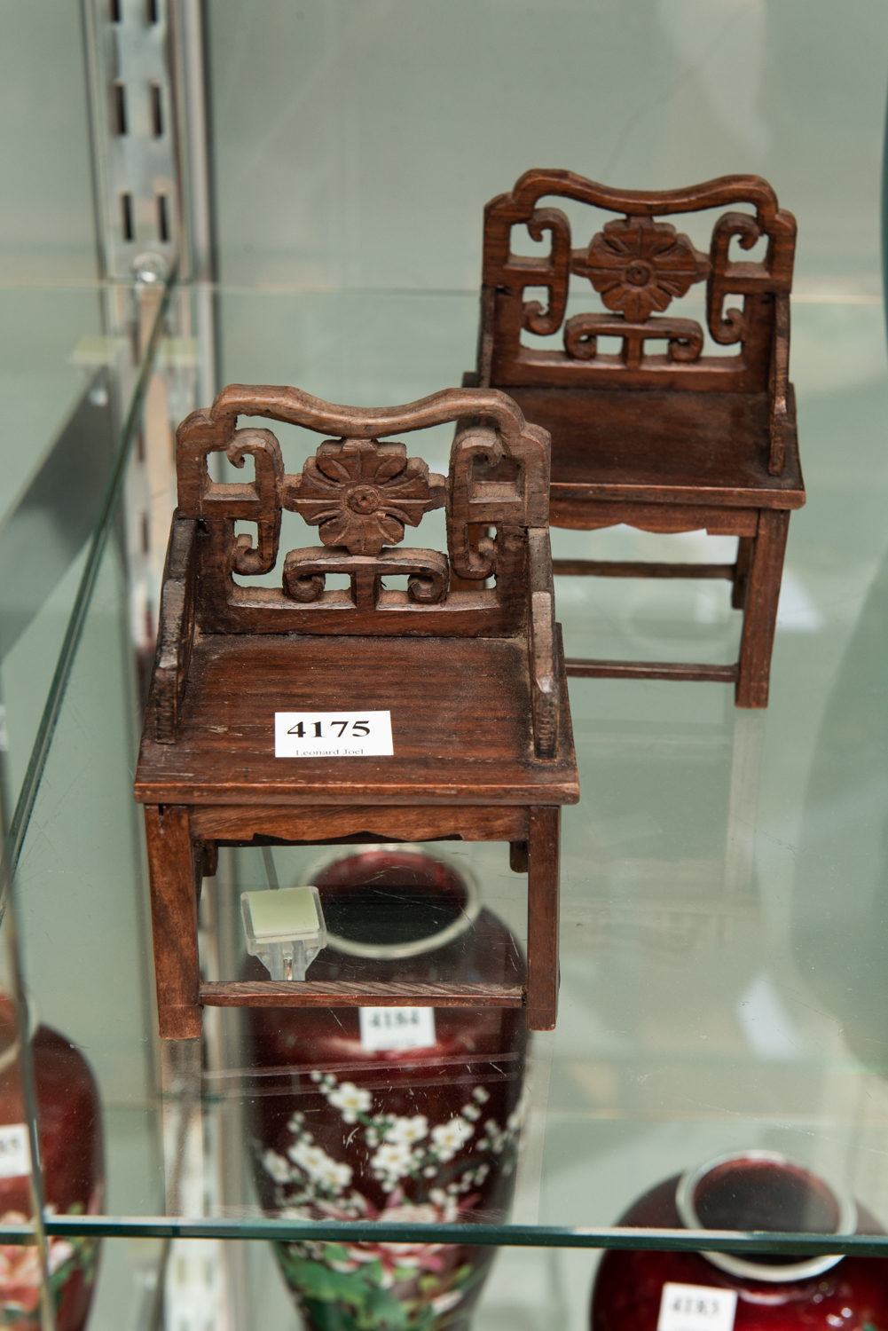 A PAIR OF MINIATURE CHINESE CARVED ROSEWOOD CHAIRS, H.13CM, LEONARD JOEL LOCAL DELIVERY SIZE: SMALL