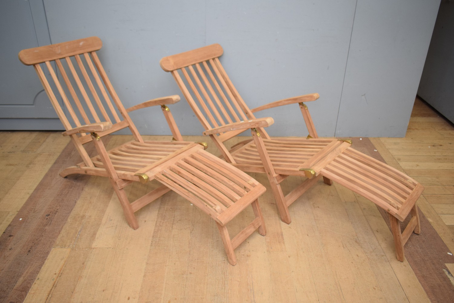 A PAIR OF TEAK STEAMER LOUNGERS (90H X 59W X 152D CM) (LEONARD JOEL DELIVERY SIZE: LARGE)