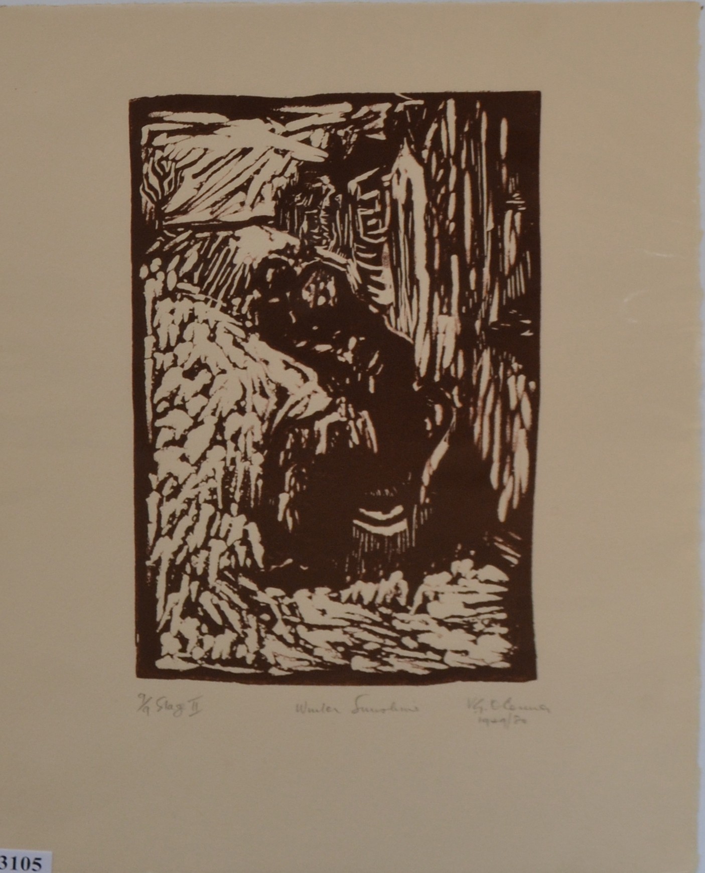 VIC O'CONNOR, WINTER SUNSHINE 1949/1980, WOODBLOCK 9/9 STAGE II, 26 X 17CM, UNFRAMED BUT BACKED AND WRAPPED FOR PROTECTION, VERY GOOD CONDITION, LEONARD JOEL DELIVERY SIZE: SMALL