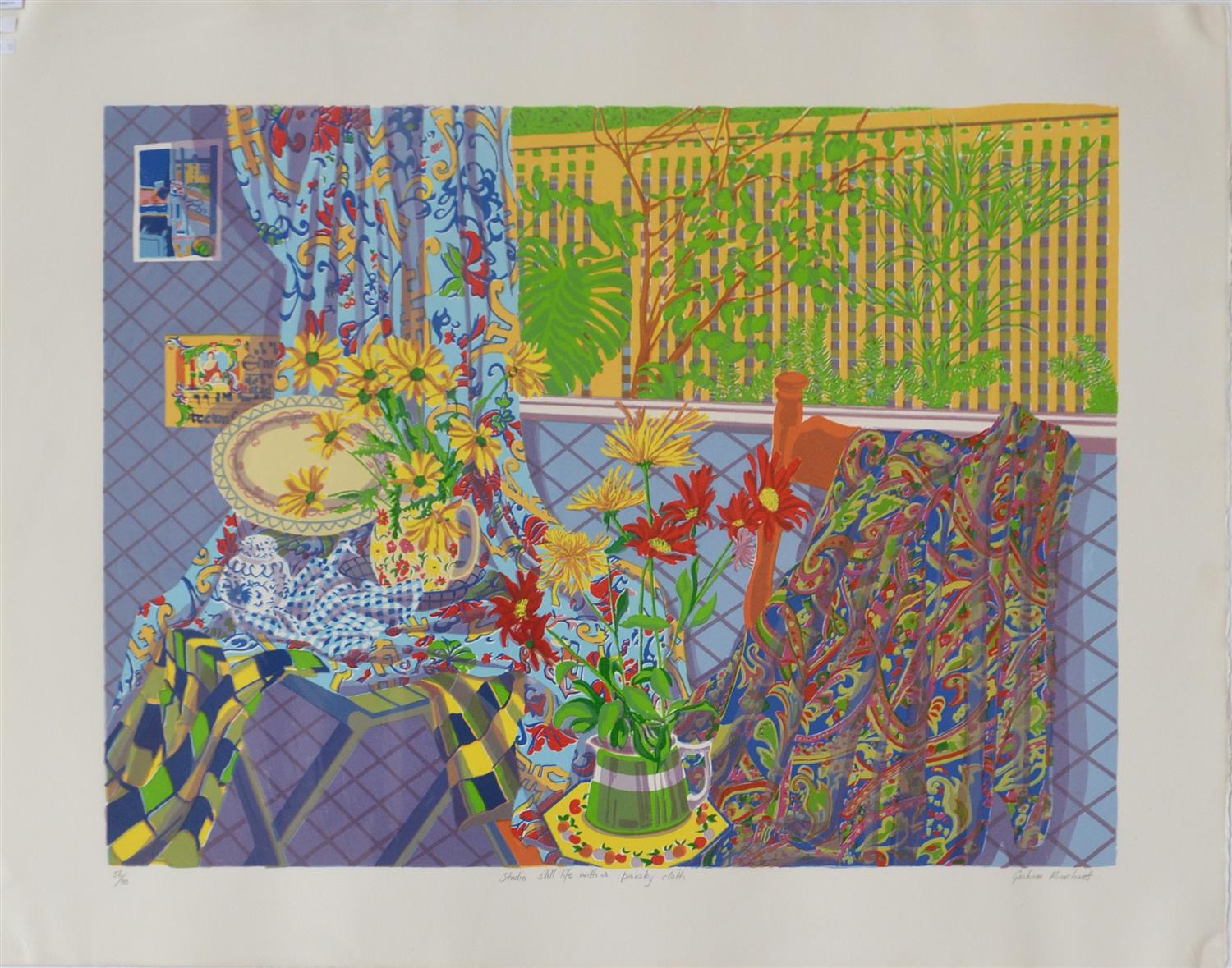 GRAHAM MARCHANT, STUDIO STILL LIFE WITH A PAISLEY CLOTH, SCRRENPRINT 56/90, 60 X 80CM, UNFRAMED BUT BACKED AND WRAPPED FOR PROTECTION, VERY GOOD CONDITION, LEONARD JOEL DELIVERY SIZE: SMALL